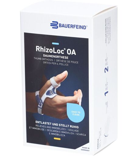 RhizoLoc® OA Daumenorthesen links Gr.1 titan Orthese zur Ruhigstellung und Entlastung des Daumengelenks. Ruhigstellung und Entlastung des Daumengelenks mit dem Ziel einer Schmerzreduktion Hoher Tragekomfort durch weiche, flexible Ränder und Perforierung Individuelle Anpassung und sicherer Halt durch einstellbare Gurte Bei einer Arthrose, Arthritis, Verletzungen oder Überlastungs- und Reizzuständen im Daumensattel- bzw. Daumengrundgelenk kann RhizoLoc OA durch gezielte Ruhigstellung Schmerzen lindern. Die Orthese bietet dank des selbsthaftenden Wickelgurts aus Klettvelour und der anatomisch geformten Kunststoffspange eine hohe Stabilisierung und positioniert den Daumen in natürlicher, entlastender Stellung. Das Gurtsystem sorgt für einen stets sicheren Sitz während deiner Alltagsaktivitäten, ohne deine Greifbewegungen einzuschränken. Weiche, flexible Ränder erhöhen den Tragekomfort der leichten Daumenorthese und die Perforierung lässt ausreichend Luft an deine Haut. Da sämtliche Materialien gleichermaßen robust, wasserfest und pflegeleicht sind, kannst du die Orthese zum Beispiel bedenkenlos während des Händewaschens oder Spülens tragen und sie anschließend einfach abtrocknen. Ein zweiter Daumengurt zum Wechseln ist im Lieferumfang enthalten, um einer Keimbildung durch Feuchtigkeit vorzubeugen. Indikationen: Arthrose (z.B. Rhizarthrose) Arthritis akut / posttraumatisch (z.B. Überlastungen, Distorsionen, Kontusionen) chronisch (Bandinstabilitäten, rezidivierende Gelenkfehlstellungen) postoperativ (z.B. nach Arthroplastik) funktionelle Beschwerden (Überlastungen, bei rezidivierenden Gelenkfehlstellungen u.ä.) Reizzustände (chronisch, akut, posttraumatisch, postoperativ) Größenhinweis Größe Handgelenkumfang* 1 14–17 2 16–20 *alle Maße in cm ...