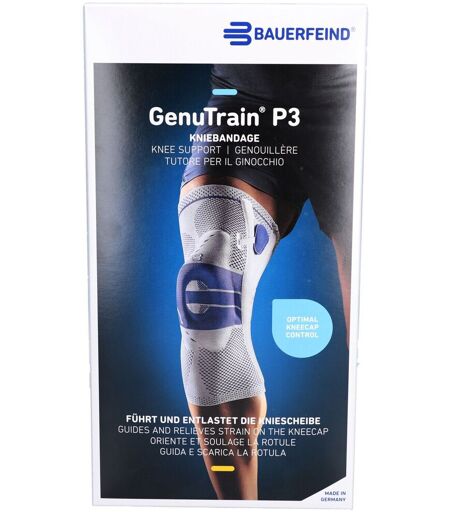 GenuTrain® Kniebandage links Gr.6 Natur Reduktion der Knieschmerzen durch Kompression und Omega+ Pad mit Meniskusflügeln Train-Gestrick entlastet und stabilisiert dein Knie über neuromuskuläre Prozesse Inklusive Therapie-App für dein individuelles Bewegungstraining Digital vermessbar mit Bodytronic-Messtechnologie Nach akuter Verletzung oder Operation, bei chronischen Veränderungen, Arthrose oder Instabilität im Knie: Die Kniebandage GenuTrain wirkt schmerzlindernd und unterstützt dich bei der Mobilisierung. Schritt für Schritt kannst du deine natürlichen Bewegungsabläufe verbessern und dein Knie stabilisieren. Das ermöglicht eine frühzeitige Aufnahme von Physiotherapie und behutsamem Training. Die GenuTrain Kniebandage gibt deinem Knie mehr Sicherheit für heilungsfördernde Bewegung. Sie lindert deine Knieschmerzen, fördert die Beweglichkeit durch eine Wechseldruckmassage und die Stimulation bestimmter Schmerzpunkte. Dabei aktiviert sie die stabilisierende Beinmuskulatur und verbessert die Koordination. Gleichzeitig fördert die GenuTrain Bandage die Durchblutung und den Abbau von Schwellungen für einen zügigen Heilungsverlauf deiner Kniebeschwerden. Eine ringförmige Pelotte, das Omega+ Pad, sorgt in Verbindung mit dem Train-Gestrick für Druckentlastung. Integrierte Druckpunkte der Pelotte wirken mit ihren speziell beweglichen Massagenoppen lindernd auf besonders schmerzhafte Bereiche. An den Seiten der Kniegelenkbandage sorgen zwei flexible Kunststoffstäbe dafür, dass die GenuTrain stets perfekt sitzt und in der Bewegung nicht verrutscht. Oben und unten erleichtern eingearbeitete Griffe das An- und Ablegen der Bandage. Das anatomisch geformte, atmungsaktive und hautfreundliche Train-Gestrick bietet einen hohen Tragekomfort. Indikationen: Tendopathie, Tendomyopathie, Ansatzligamentose, Meniskopathie, chronische, posttraumatische oder postoperative Reizzustände rezidivierender Gelenkerguss Gonarthrose / Arthritis (Gelenkverschleiß / Gelenkentzündung) Prävention / Rezidivprophylaxe Instabilitätsgefühl Pflegehinweis: Die GenuTrain ist bei 30° C in der Waschmaschine waschbar. Bitte verwende Feinwaschmittel und ein Wäschenetz. Setze dein Produkt nie direkter Hitze / Kälte aus. Beachte auch die Hinweise auf dem Einnähetikett am oberen Rand deines Produktes. Regelmäßige Pflege gewährleistet eine optimale Wirkung. ...