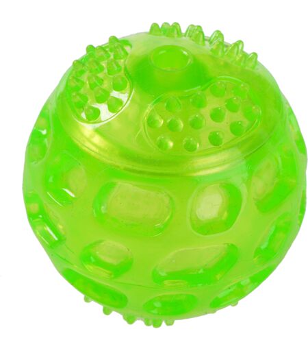 Der robuste, grüne Squeaky Spielball sorgt für viel Spaß beim Spielen mit Ihrem Hund und ist überall einsetzbar. Durch die unterschiedliche Oberflächenstruktur mit Noppen und Waben in Verbindung mit dem zahnpflegendem, flexiblen Material wird der Wurfball zu einem Massageball und trägt gleichzeitig zur Mundhygiene Ihres Lieblings bei. Der handliche Spielball in der Größe eines Tennisballes hüpft und quietscht beim Draufbeißen, wodurch die Aufmerksamkeit Ihres Vierbeiners geweckt und sein Spieltrieb angeregt wird. Ganz nebenbei wird das Zahnfleisch Ihres Lieblings massiert und seine Zähne gepflegt. Thermo-Plastic-Rubber ist ein widerstandsfähiges, flexibles Material, welches durch seine weichen Eigenschaften besonders zahnfreundlich zum Gebiss Ihres Hundes ist. Das witterungsbeständige Material ist wasserfest und schwimmfähig und eignet sich somit auch perfekt für Apportierspiele im Wasser. Durch die noppenartige Oberfläche kann Ihr Hund den Ball gut aufnehmen und tragen. Der Squeaky Ball darf in keinem Hundehaushalt fehlen und ist eine Bereicherung in der Spielzeugkiste Ihres Hundes! Hundespielzeug Squeaky Ball im Überblick: Flexibler und robuster Spielball Geeignet für kleine und mittelgroße Hunde Mit Noppenoberfläche: massiert das Zahnfleisch und fördert die Durchblutung, trägt zur Mundhygiene bei Aus TPR-Material: besonders widerstandsfähig, flexibel, witterungsbeständig und zahnfreundlich Hüpft und schwimmt: zum Apportieren im Wasser und an Land Witterungsbeständig und schwimmfähig: auch auf feuchter Wiese oder im Wasser einsetzbar Mit Squeaker: regt zum Spielen an Besonders langlebig: aus robustem, griffigem Gummi Zeit zu Zweit: sorgt für gemeinsames Spielvergnügen, fördert die Bindung zwischen Ihnen und Ihrem Hund Material: TPR (Thermo Plastic Rubber) Farbe: Grün Größe: ca. 6 cm im Durchmesser Gewicht: 50 Gramm Hinweis zur Benutzung von Hundespielzeug: Kein Spielzeug ist unzerstörbar. Wie bei jedem anderen Produkt sollten Sie Ihr Tier bei der Beschäftigung mit diesem Spielzeug beaufsichtigen. Bitte überprüfen Sie das Produkt regelmäßig auf Schäden und ersetzen Sie das Spielzeug, wenn es defekt ist oder wenn Teile verloren gehen, da ansonsten eine Verletzung des Tieres nicht ausgeschlossen werden kann. ...
