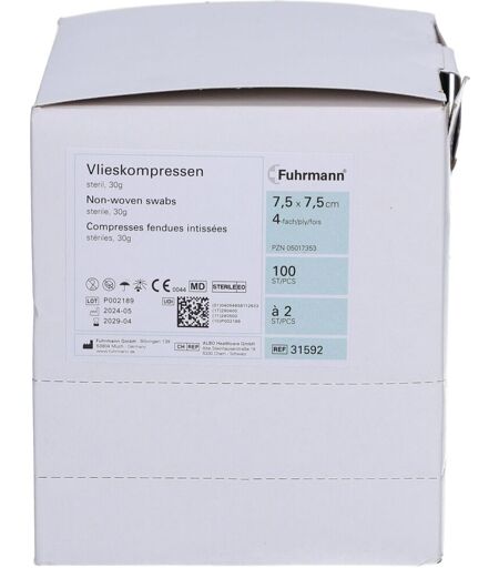 Vlieskompressen 4 fach 7,5 x 7,5 cm steril Angelehnt an DIN EN 1644-1 und 1644-2, aus 70% Viskose und 30% Polyester Nettofüllmenge: 100 Stück Herstellerdaten: Fuhrmann GmbH ...