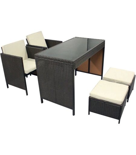 5-teiliges Lounge-Set aus Polyrattan für bis zu 4 Personen Stühle inkl. Sitz- und Rückenpolster Hocker inkl. Sitzpolster Flexible Kombination der Stühle und Hocker am Tisch Tisch mit transparenten Sicherheitsglasplatten Ineinander verstaubares, platzsparendes Set Max. Belastung: ca. 110 kg pro Sitz Material Gestell: Stahl, pulverbeschichtet Tischplatte: transparentes Sicherheitsglas Kissen: 100 % Polyester Lieferumfang 1x Tisch, 2x Stühle; 2x Hocker, 6x Kissen (Sitz- und Rückenpolster) Maße Tisch: ca. B 120 x H 82 x T 59 cm Stuhl: ca. B 54 x H 82 x T 55 cm Hocker: ca. B 44 x H 30 x T 44 cm Gewicht ca. 40 kg ...
