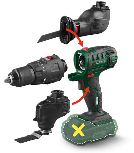 Bohrschrauber, Säbelsäge und Multifunktionsgerät Schneller; werkzeugloser Aufsatzwechsel Stufenlose Drehzahlsteuerung inkl. Links-Rechtslauf (für Bohrschrauber) und Quick-Stop Motoreinheit mit ergonomischem Griff und rutschhemmendem Softgrip Im praktischen Aufbewahrungskoffer Bohrschrauber-Aufsatz »Pkga1«: 19 Drehmomentstufen und 1 Bohrstufe einstellbar Einhülsiges Schnellspann-Bohrfutter – Spindle Lock Enthaltenes Zubehör: 6 Bohrer (1,5 / 2 / 3 / 4 / 5 / 6 mm), 6 Schrauberbits (50 mm), 1 Bit-Verlängerung (50 mm) Säbelsägen-Aufsatz »Pkga3«: Werkzeugloses Schnellspannfutter Enthaltenes Zubehör: 1 Metall-Sägeblatt (Bim 150 / 18 Tpi), 1 Holz-Sägeblatt (Hcs 150 / 6 Tpi) Multifunktionsgerät-Aufsatz »Pkga4«: Werkzeugloses Schnellspann-Wechselsystem Werkzeuge in variabler Arbeitsrichtung aufsetzbar Enthaltenes Zubehör: 1 HSS-Tauchsägeblatt; 1 Schabmesser, 1 Delta-Schleifplatte, 3 Schleifblätter (1x P 60, 1x P 80, 1x P 120) Gerät kompatibel mit allen Akkus der Serie Parkside X 20 V Team Lieferung erfolgt ohne Akku und Ladegerät Den passenden Akku sowie das Ladegerät kannst du hier bestellen. Enthaltenes Zubehör: 1x Metall-Sägeblatt (Bim 150 / 18 Tpi), 1x Holz-Sägeblatt (Hcs 150 / 6 Tpi) Technische Daten Spannung: 20 V Drehzahl: 0 – 21000 min-¹ Drehmoment: 35 Nm Bohrschrauber-Aufsatz »Pkga1«: Leerlaufdrehzahl 1. Gang: 0 – 400 min-¹ Leerlaufdrehzahl 2. Gang: 0 – 1350 min-¹ Drehmomentstufen: 19 + 1 Bohrstufe Bohrfutter-Spannweite: max. 13 mm Automatische Spindelarretierung Radialverriegelung Säbelsägen-Aufsatz »Pkga3«: Hubzahl: 0 – 3200 min-¹ (Leerlauf) Hublänge: 22 mm Multifunktionsgerät-Aufsatz »Pkga4«: Schwingzahl: 0 – 20000 min-¹ (Leerlauf) Oszillationswinkel: 3;0° Material Kunststoff Maße Bohrschrauber-Aufsatz »Pkga1«: ca. 23,2 x 6,95 x 19,5 cm Säbelsägen-Aufsatz »Pkga3«: ca. 17,6 x 11,5 x 6,8 cm Multifunktionsgerät-Aufsatz »Pkga4«: ca. 9,5 x 5,5 x 10,3 cm Gewicht Motoreinheit: ca. 640 g Bohrschrauber-Aufsatz »Pkga1«: ca. 596 g Säbelsägen-Aufsatz »Pkga3«: ca. 800 g Multifunktionsgerät-Aufsatz »Pkga4«: ca. 384 g Alle kompatiblen Geräte unserer 20-Volt-Serie findest du hier: ...