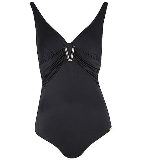 Ungefütterte Verarbeitung V-Ausschnitt Breite Träger Wattierte Cups Ohne Bügel Ohne seitliche Formstäbchen Elastisches Unterbrustband Tiefer Rückenausschnitt Gemäßigter Beinausschnitt Bedeckt den Po nahezu vollständig Goldfarbene Logo-Plakette am Beinausschnitt Drapierungsdetails Dekorative Metallschnalle vorne Shaping-Effekt: Light Shaping Material: 80% Polyamid, 20% Elasthan Farbbezeichnung: Black ...