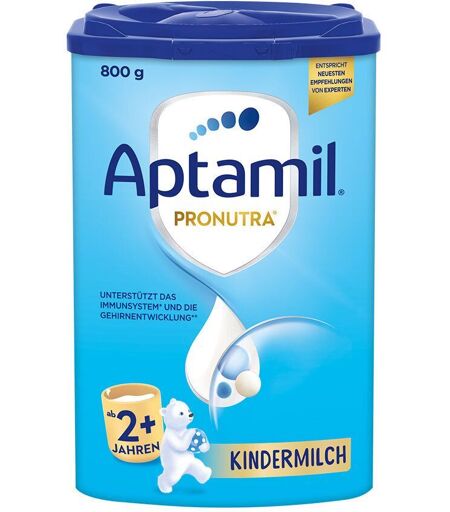 Muttermilch ist die ideale Nahrung für Säuglinge in den ersten Monaten. Sie ist gut verdaulich und so zusammengesetzt, dass sie im ersten Lebenshalbjahr den Bedarf an Nährstoffen und Flüssigkeit deckt. Bei alternativer Ernährung mit Muttermilchersatzprodukten beachten Sie die Hinweise und Zubereitungsanleitungen auf den Packungen genau, denn eine unsachgemäße Zubereitung von Säuglingsanfangsnahrung kann zu gesundheitlichen Beeinträchtigungen führen.Wir empfehlen, sich vor Anwendung von Muttermilchersatznahrung ärztlich beraten zu lassen.Bitte achten Sie auf eine abwechslungsreiche und ausgewogene Ernährung und gesunde Lebensweise.Aptamil® Kindermilch 2+ Kindernahrung ab 2 JahrAptamil Kindermilch 2+ mit wichtigen Nährstoffen für das KleinkindalterAptamil Kindermilch 2+ Kindernahrung ab 2 Jahren, 800g als Pulver entspricht den neusten Empfehlungen von Experten und ist auf die Bedürfnisse von Kleinkindern abgestimmt. Die Vitamine A, C & D unterstützen die Entwicklung des Immunsystems und ALA (Omega-3) die Gehirnentwicklung eures Kindes. Natürlich mit altersgerechtem Protein-Gehalt und ohne Palmöl. Ob warm oder kalt, zum Frühstück, Abendessen oder zwischendurch - die Aptamil Kindermilch liefert nicht nur wichtige Nährstoffe, sondern schmeckt dabei auch richtig gut!Eure Milchmomente sind so individuell wie ihr. Inspiriert von 50 Jahren Muttermilchforschung bietet Aptamil daher hochwertige Folgemilchen an, die perfekt auf eure individuellen Bedürfnisse abgestimmt sind. Zutaten:Magermilch (30%), pflanzliche Öle (Sonnenblumen-, Raps-, Kokosnussöl) (26%), Laktose (aus Milch), Galactooligosaccharide (aus Milch), Molkenerzeugnis (aus Milch), Calciumorthophosphat, Kaliumcitrat,Fructooligosaccharide, Fischöl, Calciumcarbonat, Calciumchlorid, Vitamin C, Emulgator ( Sojalecithin), Cholinchlorid, Natriumcitrat, Eisen-II-Sulfat, Kaliumchlorid, Inositol, Magnesiumchlorid, Antioxidationsmittel(Ascorbylpalmitat), Vitamin E, Pantothensäure, Niacin, Vitamin B2, Vitamin A, Vitamin D, Vitamin B6, Vitamin B1, Kaliumjodid, Folsäure, Vitamin K, Biotin, Vitamin B12.Verzehrempfehlung: Bitte verwenden Sie nur den beiliegenden Messlöffel. Gestrichen voll fasst der beiliegende Messlöffel 5,5 g AptamilKindermilch 2+. Für 1 Portion (100 ml) trinkfertige Kindermilch: 90 ml Wasser + 2 Messlöffel Aptamil Kindermilch 2+.Hinweise: Bitte nur unter ärztlicher Kontrolle verwenden. Bitte die wichtigen Hinweise auf der Packung beachten. Stillen ist das Beste für Babys. Säuglingsnahrungen sollten nur auf Rat von Kinderärzten oder anderem medizinischen Fachpersonal verwendet werden. Vor Verwendung sollte der Arzt in jedem Fall vorab die individuelle Verträglichkeit der Nahrung testen. Nicht geeignet für frühgeborene und immungeschwächte Säuglinge. Aufbewahrung:Kühl (<25°C) und trocken lagern.Nettofüllmenge:400 g PulverHerstellerdaten:Milupa GmbHBahnstraße 14-3061381 Friedrichsdorf/Ts.*Gutschein gültig bei Online-Bestellung für die folgenden Produkte des Herstellers Danone Deutschland... ...