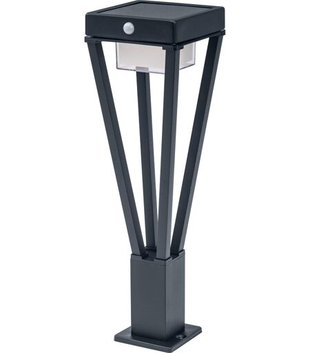 Solarbetriebene Wand- und Pollerleuchten mit Bewegungs- und Lichtsensoren. Produkteigenschaften: Solarbetriebene LED-Außenleuchten, PIR-Bewegungsmelder und Tageslichtsensor, 3 Betriebsarten wählbar, Betriebsart 1: Dauerlicht mit 200 Lumen (max. 2.5 Stunden bei voller Batterieladung), Betriebsart 2: Dauerlicht mit 75 Lumen (max. 8 Stunden bei voller Batterieladung), schaltet bei Bewegung auf 300 Lumen (max. 100 Schaltungen bei voller Batterieladung), Betriebsart 3: Licht aus, schaltet bei Bewegung auf 550 Lumen (max. 100 Schaltungen bei voller Batterieladung), Batterieaufladung mittels Solarzelle, Batterietechnologie: Lithium-Ionen, Gehäuse aus Edelstahl, Produktvorteile: Bedarfsgerechte Beleuchtung und Energieeinsparung mittels Bewegung- und Tageslichtsensor, Einfache Einstellung von Tageslicht- und Bewegungserkennung über Knopfdruck, Energieeffizient durch LED-Technik, Einfache und schnelle Installation, Anwendungsgebiete: Außenanwendung (IP44), Bereiche, in denen kein Stromanschluss verfügbar ist, Technische Ausstattung: Vollständiges Montage- und Anschlusszubehör enthalten, Technische Daten: Länge: 150 mm, Breite: 150 mm, Höhe: 500 mm, Nettogewicht: 1140 g, Nennspannung: 3 V, Nennstrom: 1700 mA, Bemessungsleistung: 6 W, Energieverbrauch: 6 kWh/1000, Farbtemperatur: 3000 K, Lichtfarbe: Warm weiß, Lichtstrom: 550 lm, Farbwiedergabe: 80 CRI, Lebensdauer: 25000 h, Schaltzyklen: 12500, Dimmbar: Nein, Material: Aluminium, Farbe: Schwarz, EAN: 4058075564565 ...