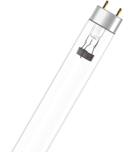 Ultraviolette keimtötende Lampen. Produkteigenschaften: Hohe UV-C-Strahlungsdichte bei 254 nm, Produktvorteile: Effektive und umweltfreundliche Entkeimung ohne Chemikalien, Niedriger Quecksilbergehalt, Ozonfrei, Lange Lebensdauer (10 800 h) durch spezielle Beschichtung, Anwendungsgebiete: Luftreinigung, Wasserreinigung, Oberflächensterilisation, Technische Daten: Länge: 1213,60 mm, Breite: 25,50 mm, Durchmesser: 25,50 mm, Nettogewicht: 180 g, Sockel: G13, Nennspannung: 103 V, Nennstrom: 430 mA, Bemessungsleistung: 36 W, Energieverbrauch: 36 kWh/1000, Lebensdauer: 10800 h, Dimmbar: Nein, Farbe: Transparent, EAN: 4058075502666 ...