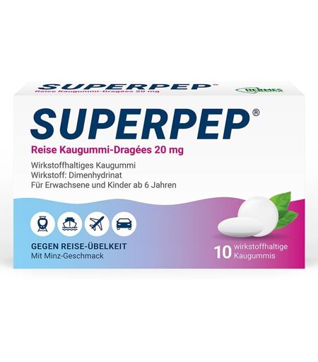 Anwendungsgebiet von Superpep Reise Kaugummi-Dragees 20mg Superpep Reise Kaugummi-Dragees 20mg gehören zur Gruppe der H1-Antihistaminika und werden angewendet zur Vorbeugung und Behandlung von Übelkeit und Erbrechen bei leichteren Fällen der Reisekrankheit. Sie sind für Erwachsene und Kinder ab 6 Jahren geeignet. Einfach zur Vorbeugung vor Reisebeginn oder bei ersten Anzeichen von Übelkeit ein Kaugummi-Dragee aus der Verpackung drücken und gründlich kauen. Bei jedem zehnten Urlauber beginnen die schönsten Wochen des Jahres mit Reiseübelkeit. Besonders Frauen und Kinder sind von den typischen Symptomen betroffen. Bei Flugreisen tritt die Reisekrankheit in erster Linie bei Start und Landung auf. Die praktischen Reisekaugummis helfen nicht nur durch den effizienten Wirkstoff, das Kauen sorgt zusätzlich für einen Druckausgleich im Innenohr. Kindern unter 12 Jahren wird es meist auf Autofahrten schlecht. Zur Vorbeugung kann das Kaugummi bereits eine Stunde vor Reiseeintritt genommen werden, um Übelkeit zu reduzieren und ein Erbrechen zu verhindern. Die vorbeugende Einnahme empfiehlt sich auch für alle, die an Bord einer Segelyacht oder eines Kreuzfahrtschiffs gehen. Ergänzend zur Anwendung von Superpep Reise Kaugummi-Dragees 20mg sollte der Genuss schwer verdaulicher Speisen und Alkohol vermieden werden. Wirkungsweise von Superpep Reise Kaugummi-Dragees 20mgReisekrankheit geht zwar mit starker Übelkeit und Erbrechen einher, entsteht jedoch nicht im Magen-Darm-Trakt, sondern im Gehirn. Durch schnell vorbeiziehende Bilder und plötzliche Beschleunigungen von Auto, Bahn, Schiff oder Flugzeug wird der Gleichgewichtssinn durcheinandergebracht und es kommt zu einer vermehrten Ausschüttung des Botenstoffs Histamin, der das Brechzentrum im Gehirn anregt. Genau hier greift der bewährte Wirkstoff Dimenhydrinat ein. Dieser unterdrückt Botenstoffe im Gehirn, die das Brechzentrum stimulieren. Übelkeit und Schwindelgefühle gehen spürbar zurüc ...