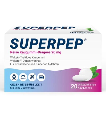 Anwendungsgebiet von Superpep Reise Kaugummi-Dragees 20mg Superpep Reise Kaugummi-Dragees 20mg gehören zur Gruppe der H1-Antihistaminika und werden angewendet zur Vorbeugung und Behandlung von Übelkeit und Erbrechen bei leichteren Fällen der Reisekrankheit. Sie sind für Erwachsene und Kinder ab 6 Jahren geeignet. Einfach zur Vorbeugung vor Reisebeginn oder bei ersten Anzeichen von Übelkeit ein Kaugummi-Dragee aus der Verpackung drücken und gründlich kauen. Bei jedem zehnten Urlauber beginnen die schönsten Wochen des Jahres mit Reiseübelkeit. Besonders Frauen und Kinder sind von den typischen Symptomen betroffen. Bei Flugreisen tritt die Reisekrankheit in erster Linie bei Start und Landung auf. Die praktischen Reisekaugummis helfen nicht nur durch den effizienten Wirkstoff, das Kauen sorgt zusätzlich für einen Druckausgleich im Innenohr. Kindern unter 12 Jahren wird es meist auf Autofahrten schlecht. Zur Vorbeugung kann das Kaugummi bereits eine Stunde vor Reiseeintritt genommen werden, um Übelkeit zu reduzieren und ein Erbrechen zu verhindern. Die vorbeugende Einnahme empfiehlt sich auch für alle, die an Bord einer Segelyacht oder eines Kreuzfahrtschiffs gehen. Ergänzend zur Anwendung von Superpep Reise Kaugummi-Dragees 20mg sollte der Genuss schwer verdaulicher Speisen und Alkohol vermieden werden. Wirkungsweise von Superpep Reise Kaugummi-Dragees 20mgReisekrankheit geht zwar mit starker Übelkeit und Erbrechen einher, entsteht jedoch nicht im Magen-Darm-Trakt, sondern im Gehirn. Durch schnell vorbeiziehende Bilder und plötzliche Beschleunigungen von Auto, Bahn, Schiff oder Flugzeug wird der Gleichgewichtssinn durcheinandergebracht und es kommt zu einer vermehrten Ausschüttung des Botenstoffs Histamin, der das Brechzentrum im Gehirn anregt. Genau hier greift der bewährte Wirkstoff Dimenhydrinat ein. Dieser unterdrückt Botenstoffe im Gehirn, die das Brechzentrum stimulieren. Übelkeit und Schwindelgefühle gehen spürbar zurüc ...