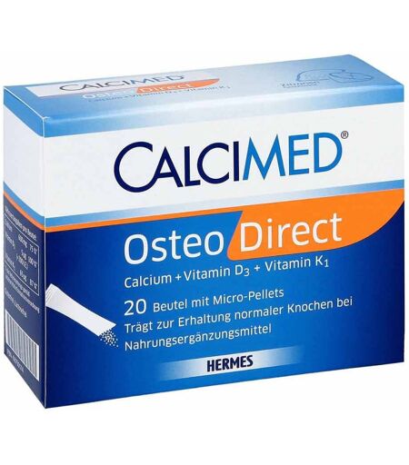 Anwendungsgebiet von Calcimed Osteo Direct Micro-pelletsCalcimed Osteo Direct Micro-pellets sind ein Nahrungsergänzungsmittel mit Süßungsmitteln und Zitronengeschmack, Micro‐Pellets mit Calcium, Vitamin D3 und Vitamin K1.Wirkstoffe / Inhaltsstoffe / ZutatenZutaten von Calcimed Osteo Direct Micro-pellets: Calciumcarbonat, Süßungsmittel (Sorbit, Xylit), Vitamin D3, Vitamin K1, Säureregulator (Natriumcitrate), Säuerungsmittel (Citronensäure), Aroma, Trennmittel (Magnesiumsalze der Speisefettsäuren, Siliciumdioxid), Feuchthaltemittel (Glycerin), Süßungsmittel (Aspartam). pro Beutel: Calcium 600 mg 75% Vitamin D3 5 μg 100% Vitamin K1 65 μg 87% % der Referenzmenge gemäß LebensmittelinformationsverordnungGegenanzeigenBei bekannter Überempfindlichkeit gegenüber einem der oben genannten Inhaltsstoffe sollte dieses Produkt nicht angewendet werden.DosierungVerzehrsempfehlung von Calcimed Osteo Direct Micro-pellets: 1x täglich den Inhalt eines Beutels verzehren. Wir empfehlen, den Beutelinhalt nicht auf einmal, sondern portionsweise einzunehmen. Die Micro‐Pellets direkt auf die Zunge geben, langsam zergehen lassen und schlucken.HinweiseNahrungsergänzungsmittel sind kein Ersatz für eine ausgewogene und abwechslungsreiche Ernährung. Calcimed Osteo Direct Micro-pellets sollten außerhalb der Reichweite von Kindern aufbewahrt werden. Die täglich empfohlene Verzehrmenge sollte nicht überschritten werden. Enthält eine Phenylalaninquelle. Kann bei übermäßigem Verzehr abführend wirken. Ähnliche Suchbegriffe: Calcium, Kalzium, Calcium Mangel, Calciummangel Calcimed Osteo Direct Micro-pellets können in Ihrer Versandapotheke www.juvalis.de erworben werden. ...