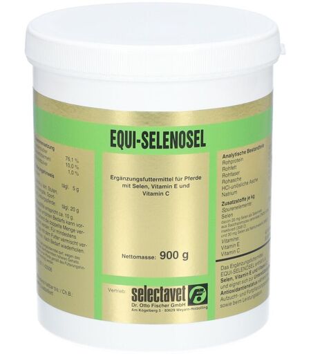 Ergänzungsfuttermittel zur Versorgung mit Selen, Vitamin E und C für PferdeEignet sich zur Unterstüzung des Antioxidantienstatus während der Aufzucht- und FortpflanzungspErgänzungsfuttermittel zur Versorgung mit Selen, Vitamin E und C für PferdeEignet sich zur Unterstüzung des Antioxidantienstatus während der Aufzucht- und Fortpflanzungsperiode sowie beim Leistungssport.Selenmangel führt beim Pferd u. a. zu degenerativen Skelett- und Herzmuskelerkrankungen. Betroffen sind Tiere jeden Alters, besonders Fohlen, wenn die tragenden und säugenden Stuten nicht ausreichend mit Selen versorgt werden.Auch sind die Aufzuchtleistungen der Fohlen herabgesetzt. Zu beachten ist, dass die üblichen Futtermittel selenarm sind. Selen ist essentieller Bestandteil des Redox-Systems Glutathionperoxidase.Die Funktionen der Skelett- und Herzmuskulatur werden optimiert, wenn dem Zellstoffwechsel zusätzlich weitere antioxidative Substanzen in Form von Vitamin E und Vitamin C in ausreichender Konzentration zur Verfügung stehen.Unter ihrem Schutz wird gleichzeitig im Allgemeimstoffwechsel einer Immunsuppression entgegengewirkt.EQUI-SELENOSEL ist daher für Fohlen, tragende und laktierende Stuten, Deckhengste sowie für Sport- und Leistungspferde ein wichtiges Futtersupplement.ZusammensetzungTraubenzucker 78,1 %Weizenfuttermehl 10,0 %Molkepulver 1,0 %Analytische BestandteileRohprotein 2,0 %Rohfett 5,4 %Rohfaser 1,0 %Rohasche 4,1 %Natrium 0,1 %Analytische Bestandteile je kgSpurenelemente: Selen 50 mgdavon 20 mg Selen als Selenmethionin aus Saccharomyces serevislae CNCMI-3399 (interaktivierte Selenhefe) (3b8, 12) und 30 mg Selen als Natriumselenit (E8).Vitamin E 40 000 mgVitamin C 30 000 mgFütterungshinweisFohlen tägl. 5 ggravide u. lakt. Stuten, Deckhengste, Sport- und Leistungspferde: tägl. 20 gMit dem Futter vermischt verabreichen.Zur Dauerverabreichung geeignet.Ein Messlöffel entspricht ca. 10 g. Nettofüllmenge: 900 g eriode sowie beim Leistungssport.Selenmangel führt beim Pferd u. a. zu degenerativen Skelett- und Herzmuskelerkrankungen. Betroffen sind Tiere jeden Alters, besonders Fohlen, wenn die tragenden und säugenden Stuten nicht ausreichend mit Selen versorgt werden.Auch sind die Aufzuchtleistungen der Fohlen herabgesetzt. Zu beachten ist, dass die üblichen Futtermittel selenarm sind. Selen ist essentieller Bestandteil des Redox-Systems Glutathionperoxidase.Die Funktionen der Skelett- und Herzmuskulatur werden optimiert, wenn dem Zellstoffwechsel zusätzlich weitere antioxidative Substanzen in Form von Vitamin E und Vitamin C in ausreichender Konzentration zur Verfügung stehen.Unter ihrem Schutz wird gleichzeitig im Allgemeimstoffwechsel einer Immunsuppression entgegengewirkt.EQUI-SELENOSEL ist daher für Fohlen, tragende und laktierende Stuten, Deckhengste sowie für Sport- und Leistungspferde ein wichtiges Futtersupplement.ZusammensetzungTraubenzucker 78,1 %Weizenfuttermehl 10,0 %Molkepulver 1,0 %Analytische BestandteileRohprotein 2,0 %Rohfett 5,4 %Rohfaser 1,0... ...