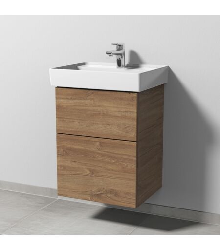 "Sanipa 3way Waschtischunterbau zu Villeroy & Boch Collaro Waschtisch mit 2 Auszügen, Eiche-Kansas, SM83259 3way Das Bad wird zur Bühne - Sie führen Regie beim Spiel mit Formen, Farben und Größen. Drei Waschtisch-Materialien, drei Arten von Schrankmodellen und drei mögliche Griffvarianten bieten viele Lösungen, um die Geschichte zu einem großen Familienbad oder über ein kleines Gäste-WC zu erzählen. Das durchdachte System von 3way macht mit seinen individuellen Details ein großes Werk möglich. Der Applaus gehört Ihnen. Das bietet 3way: Breite Auswahl an Waschtischen in Größe und im Material mit passendem Unterbau im Set Unterbauten zu zahlreichen Waschtischen verschiedener Hersteller wählbar Grifflose Fronten mit seitlicher Griffleiste zum Öffnen und als Designmerkmal, optional klassisch mit Stangengriff Eleganter Aufsatzgriff oder grifflos mit Push to open Technik Praktische Stauraummöbel mit integriertem Wäschekorb oder Ganzkörperspiegel und Regalelemente Einzelne Beimöbel in zwei verschiedenen Tiefen Produktdetails: Push to open Technik 2 Metall-Vollauszüge Auszüge mit Selbsteinzug für leichten Lauf und sanftes Schließen Auszüge mit rutschhemmendem Boden Oberer Auszug mit eckigem Siphonausschnitt Innenfarbe Auszüge: Anthrazit Passender Waschtisch: Villeroy & Boch Collaro Keramik-Waschtisch, Breite 50,0 cm (4334 50/51) Zusatzinformationen: Waschtisch nicht im Lieferumfang enthalten, bitte separat bestellen Farb- und Strukturabweichungen in den Abbildungen möglich weitere Produktdetails: Breite(cm): 45 Höhe(cm): 58,8 Tiefe(cm): 37,7 Gewicht (kg): 15,18 Material Korpus: Spanplatte Material Front: Spanplatte Material Griff: Oberfläche Korpus: Melamin Oberfläche Front: Melamin Farbe Korpus: Eiche-Kansas Farbe Front: Eiche-Kansas Farbe Griff: Griff: Ohne Griff Öffnungsart: Mit Auszug Montage: Wandmontage Montagezustand: Montiert Lieferumfang: Waschtischunterschrank, Befestigung Einbauart Waschtisch: Für Wandwaschtische Besonderheiten: Mit Push to open Technik Beleuchtung: Ohne Beleuchtung Über den Hersteller Sanipa: Das Unternehmen Sanipa mit Sitz im fränkischen Treuchtlingen ist eine hundertprozentige Tochter der Villeroy & Boch AG und zählt zu den renommierten Partnern für den Sanitär-Fachhandel. Sanipa setzt auf Produkte, die in bester Handwerkstradition hergestellt werden und fortschrittliche Technik mit aktuellem Design verbinden. Die Badmöbel sind ""made in Germany"" und können individuell an Kundenwünsche angepasst werden." ...