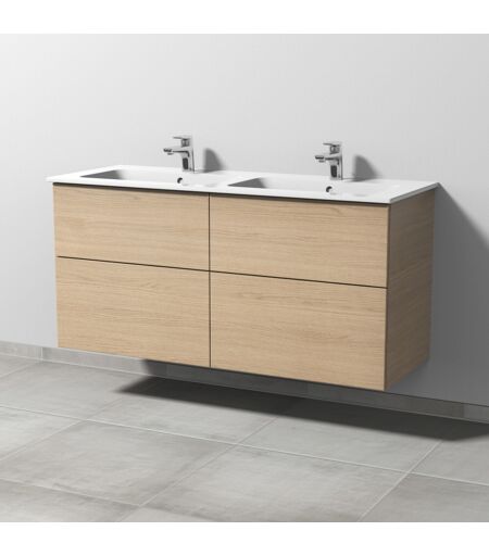 "Sanipa 3way Waschtischunterbau zu Duravit ME by Starck Waschtisch mit 4 Auszügen, Eiche-Nordic, SM72848 3way Das Bad wird zur Bühne - Sie führen Regie beim Spiel mit Formen, Farben und Größen. Drei Waschtisch-Materialien, drei Arten von Schrankmodellen und drei mögliche Griffvarianten bieten viele Lösungen, um die Geschichte zu einem großen Familienbad oder über ein kleines Gäste-WC zu erzählen. Das durchdachte System von 3way macht mit seinen individuellen Details ein großes Werk möglich. Der Applaus gehört Ihnen. Das bietet 3way: Breite Auswahl an Waschtischen in Größe und im Material mit passendem Unterbau im Set Unterbauten zu zahlreichen Waschtischen verschiedener Hersteller wählbar Grifflose Fronten mit seitlicher Griffleiste zum Öffnen und als Designmerkmal, optional klassisch mit Stangengriff Eleganter Aufsatzgriff oder grifflos mit Push to open Technik Praktische Stauraummöbel mit integriertem Wäschekorb oder Ganzkörperspiegel und Regalelemente Einzelne Beimöbel in zwei verschiedenen Tiefen Produktdetails: Push to open Technik 4 Metall-Vollauszüge Auszüge mit Selbsteinzug für leichten Lauf und sanftes Schließen Auszüge mit rutschhemmendem Boden Obere Auszüge mit eckigem Siphonausschnitt Innenfarbe Auszüge: Anthrazit Passender Waschtisch: Duravit ME by Starck Keramik-Waschtisch, Breite 130,0 cm (2336 13) Zusatzinformationen: Waschtisch nicht im Lieferumfang enthalten, bitte separat bestellen Farb- und Strukturabweichungen in den Abbildungen möglich weitere Produktdetails: Breite(cm): 127 Höhe(cm): 61,3 Tiefe(cm): 46,7 Gewicht (kg): 63,48 Material Korpus: Spanplatte Material Front: Spanplatte Material Griff: Oberfläche Korpus: Melamin Oberfläche Front: Melamin Farbe Korpus: Eiche-Nordic Farbe Front: Eiche-Nordic Farbe Griff: Griff: Ohne Griff Öffnungsart: Mit Auszug Montage: Wandmontage Montagezustand: Montiert Lieferumfang: Waschtischunterschrank, Befestigung Einbauart Waschtisch: Für Doppelwaschtische Besonderheiten: Mit Push to open Technik Beleuchtung: Ohne Beleuchtung Über den Hersteller Sanipa: Das Unternehmen Sanipa mit Sitz im fränkischen Treuchtlingen ist eine hundertprozentige Tochter der Villeroy & Boch AG und zählt zu den renommierten Partnern für den Sanitär-Fachhandel. Sanipa setzt auf Produkte, die in bester Handwerkstradition hergestellt werden und fortschrittliche Technik mit aktuellem Design verbinden. Die Badmöbel sind ""made in Germany"" und können individuell an Kundenwünsche angepasst werden." ...