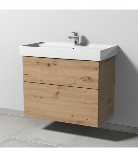 "Sanipa 3way Waschtischunterbau zu Villeroy & Boch Collaro Waschtisch mit 2 Auszügen, Eiche Natural-Touch, SM83685 3way Das Bad wird zur Bühne - Sie führen Regie beim Spiel mit Formen, Farben und Größen. Drei Waschtisch-Materialien, drei Arten von Schrankmodellen und drei mögliche Griffvarianten bieten viele Lösungen, um die Geschichte zu einem großen Familienbad oder über ein kleines Gäste-WC zu erzählen. Das durchdachte System von 3way macht mit seinen individuellen Details ein großes Werk möglich. Der Applaus gehört Ihnen. Das bietet 3way: Breite Auswahl an Waschtischen in Größe und im Material mit passendem Unterbau im Set Unterbauten zu zahlreichen Waschtischen verschiedener Hersteller wählbar Grifflose Fronten mit seitlicher Griffleiste zum Öffnen und als Designmerkmal, optional klassisch mit Stangengriff Eleganter Aufsatzgriff oder grifflos mit Push to open Technik Praktische Stauraummöbel mit integriertem Wäschekorb oder Ganzkörperspiegel und Regalelemente Einzelne Beimöbel in zwei verschiedenen Tiefen Produktdetails: Push to open Technik 2 Metall-Vollauszüge Auszüge mit Selbsteinzug für leichten Lauf und sanftes Schließen Auszüge mit rutschhemmendem Boden Oberer Auszug mit eckigem Siphonausschnitt Innenfarbe Auszüge: Anthrazit Passender Waschtisch: Villeroy & Boch Collaro Keramik-Waschtisch, Breite 80,0 cm (4A33 80/81/83) Zusatzinformationen: Waschtisch nicht im Lieferumfang enthalten, bitte separat bestellen Farb- und Strukturabweichungen in den Abbildungen möglich weitere Produktdetails: Breite(cm): 75 Höhe(cm): 58,8 Tiefe(cm): 44,7 Gewicht (kg): 26,68 Material Korpus: Spanplatte Material Front: Spanplatte Material Griff: Oberfläche Korpus: Melamin Oberfläche Front: Melamin Farbe Korpus: Eiche Natural-Touch Farbe Front: Eiche Natural-Touch Farbe Griff: Griff: Ohne Griff Öffnungsart: Mit Auszug Montage: Wandmontage Montagezustand: Montiert Lieferumfang: Waschtischunterschrank, Befestigung Einbauart Waschtisch: Für Wandwaschtische Besonderheiten: Mit Push to open Technik Beleuchtung: Ohne Beleuchtung Über den Hersteller Sanipa: Das Unternehmen Sanipa mit Sitz im fränkischen Treuchtlingen ist eine hundertprozentige Tochter der Villeroy & Boch AG und zählt zu den renommierten Partnern für den Sanitär-Fachhandel. Sanipa setzt auf Produkte, die in bester Handwerkstradition hergestellt werden und fortschrittliche Technik mit aktuellem Design verbinden. Die Badmöbel sind ""made in Germany"" und können individuell an Kundenwünsche angepasst werden." ...