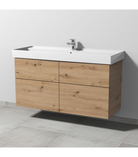 "Sanipa 3way Waschtischunterbau zu Villeroy & Boch Collaro Waschtisch mit 4 Auszügen, Eiche Natural-Touch, SM83885 3way Das Bad wird zur Bühne - Sie führen Regie beim Spiel mit Formen, Farben und Größen. Drei Waschtisch-Materialien, drei Arten von Schrankmodellen und drei mögliche Griffvarianten bieten viele Lösungen, um die Geschichte zu einem großen Familienbad oder über ein kleines Gäste-WC zu erzählen. Das durchdachte System von 3way macht mit seinen individuellen Details ein großes Werk möglich. Der Applaus gehört Ihnen. Das bietet 3way: Breite Auswahl an Waschtischen in Größe und im Material mit passendem Unterbau im Set Unterbauten zu zahlreichen Waschtischen verschiedener Hersteller wählbar Grifflose Fronten mit seitlicher Griffleiste zum Öffnen und als Designmerkmal, optional klassisch mit Stangengriff Eleganter Aufsatzgriff oder grifflos mit Push to open Technik Praktische Stauraummöbel mit integriertem Wäschekorb oder Ganzkörperspiegel und Regalelemente Einzelne Beimöbel in zwei verschiedenen Tiefen Produktdetails: Push to open Technik 4 Metall-Vollauszüge Auszüge mit Selbsteinzug für leichten Lauf und sanftes Schließen Auszüge mit rutschhemmendem Boden Innenfarbe Auszüge: Anthrazit Passender Waschtisch: Villeroy & Boch Collaro Keramik-Waschtisch, Breite 120,0 cm (4A33 C1/C2/C3/C4/C5) Zusatzinformationen: Waschtisch nicht im Lieferumfang enthalten, bitte separat bestellen Farb- und Strukturabweichungen in den Abbildungen möglich weitere Produktdetails: Breite(cm): 115 Höhe(cm): 58,8 Tiefe(cm): 44,7 Gewicht (kg): 36,8 Material Korpus: Spanplatte Material Front: Spanplatte Material Griff: Oberfläche Korpus: Melamin Oberfläche Front: Melamin Farbe Korpus: Eiche Natural-Touch Farbe Front: Eiche Natural-Touch Farbe Griff: Griff: Ohne Griff Öffnungsart: Mit Auszug Montage: Wandmontage Montagezustand: Montiert Lieferumfang: Waschtischunterschrank, Befestigung Einbauart Waschtisch: Für Wandwaschtische Besonderheiten: Mit Push to open Technik Beleuchtung: Ohne Beleuchtung Über den Hersteller Sanipa: Das Unternehmen Sanipa mit Sitz im fränkischen Treuchtlingen ist eine hundertprozentige Tochter der Villeroy & Boch AG und zählt zu den renommierten Partnern für den Sanitär-Fachhandel. Sanipa setzt auf Produkte, die in bester Handwerkstradition hergestellt werden und fortschrittliche Technik mit aktuellem Design verbinden. Die Badmöbel sind ""made in Germany"" und können individuell an Kundenwünsche angepasst werden." ...