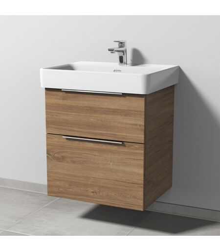"Sanipa 3way Waschtischunterbau zu Laufen Pro S Waschtisch mit 2 Auszügen, Eiche-Kansas, UM76659 3way Das Bad wird zur Bühne - Sie führen Regie beim Spiel mit Formen, Farben und Größen. Drei Waschtisch-Materialien, drei Arten von Schrankmodellen und drei mögliche Griffvarianten bieten viele Lösungen, um die Geschichte zu einem großen Familienbad oder über ein kleines Gäste-WC zu erzählen. Das durchdachte System von 3way macht mit seinen individuellen Details ein großes Werk möglich. Der Applaus gehört Ihnen. Das bietet 3way: Breite Auswahl an Waschtischen in Größe und im Material mit passendem Unterbau im Set Unterbauten zu zahlreichen Waschtischen verschiedener Hersteller wählbar Grifflose Fronten mit seitlicher Griffleiste zum Öffnen und als Designmerkmal, optional klassisch mit Stangengriff Eleganter Aufsatzgriff oder grifflos mit Push to open Technik Praktische Stauraummöbel mit integriertem Wäschekorb oder Ganzkörperspiegel und Regalelemente Einzelne Beimöbel in zwei verschiedenen Tiefen Produktdetails: Eleganter Aufsatz-Griff in Chrom Grifflänge: 33,0 cm Griffplatzierung: oben mittig 2 Metall-Vollauszüge Auszüge mit Selbsteinzug für leichten Lauf und sanftes Schließen Auszüge mit rutschhemmendem Boden Oberer Auszug mit eckigem Siphonausschnitt Innenfarbe Auszüge: Anthrazit Passender Waschtisch: Laufen Pro S Keramik-Waschtisch, Breite 60,0 cm (8109 63) Zusatzinformationen: Waschtisch nicht im Lieferumfang enthalten, bitte separat bestellen Aufsatz-Griff optional auch in Schwarz-Matt erhältlich Farb- und Strukturabweichungen in den Abbildungen möglich weitere Produktdetails: Breite(cm): 55 Höhe(cm): 59,3 Tiefe(cm): 43,7 Gewicht (kg): 20,24 Material Korpus: Spanplatte Material Front: Spanplatte Material Griff: Metall Oberfläche Korpus: Melamin Oberfläche Front: Melamin Farbe Korpus: Eiche-Kansas Farbe Front: Eiche-Kansas Farbe Griff: Chrom Griff: mit Griff Öffnungsart: Mit Auszug Montage: Wandmontage Montagezustand: Montiert Lieferumfang: Waschtischunterschrank, Befestigung Einbauart Waschtisch: Für Wandwaschtische Besonderheiten: Beleuchtung: Ohne Beleuchtung Über den Hersteller Sanipa: Das Unternehmen Sanipa mit Sitz im fränkischen Treuchtlingen ist eine hundertprozentige Tochter der Villeroy & Boch AG und zählt zu den renommierten Partnern für den Sanitär-Fachhandel. Sanipa setzt auf Produkte, die in bester Handwerkstradition hergestellt werden und fortschrittliche Technik mit aktuellem Design verbinden. Die Badmöbel sind ""made in Germany"" und können individuell an Kundenwünsche angepasst werden." ...