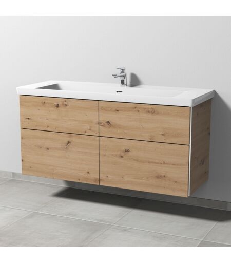 "Sanipa 3way Waschtischunterbau zu Villeroy & Boch Subway 3.0 Waschtisch mit 4 Auszügen, Eiche Natural-Touch 3way Das Bad wird zur Bühne.Sie führen Regie beim Spiel mit Formen, Farben und Größen. Drei Waschtisch-Materialien, drei Arten von Schrankmodellen und drei mögliche Griffvarianten bieten viele Lösungen, um die Geschichte zu einem großen Familienbad oder über ein kleines Gäste-WC zu erzählen. Das durchdachte System von 3way macht mit seinen individuellen Details ein großes Werk möglich. Der Applaus gehört Ihnen. Das bietet 3way: Breite Auswahl an Waschtischen in Größe und im Material mit passendem Unterbau im Set Unterbauten zu zahlreichen Waschtischen verschiedener Hersteller wählbar Grifflose Fronten mit seitlicher Griffleiste zum Öffnen und als Designmerkmal, optional klassisch mit Stangengriff Eleganter Aufsatzgriff oder grifflos mit Push to open Technik Praktische Stauraummöbel mit integriertem Wäschekorb oder Ganzkörperspiegel und Regalelemente Einzelne Beimöbel in zwei verschiedenen Tiefen Produktdetails: Griffleiste links und rechts in Chrom Grifflose Fronten mit seitlicher Griffleiste zum Öffnen und als Designmerkmal 4 Metall-Vollauszüge Auszüge mit Selbsteinzug für leichten Lauf und sanftes Schließen Auszüge mit rutschhemmendem Boden Innenfarbe Auszüge: Anthrazit Passender Waschtisch: Villeroy & Boch Subway 3.0 Keramik-Waschtisch, Breite 130,0 cm (4A70 D1/D2/D3/D4/D5) Zusatzinformationen: Waschtisch nicht im Lieferumfang enthalten, bitte separat bestellen Griffleiste optional auch in Schwarz-Matt erhältlich Waschtischunterbau optional auch klassisch mit Stangengriffen erhältlich Zum Öffnen bitte seitlich links und rechts Wandabstand einplanen Farb- und Strukturabweichungen in den Abbildungen möglich weitere Produktdetails: passend zu: Villeroy & Boch Subway 3.0 4A70D1 / 4A70D2 / 4A70D3 / 4A70D4 / 4A70D5 Breite (cm): 125,5 Höhe (cm): 58,8 Tiefe (cm): 46,2 Material Korpus: Spanplatte Material Front: Spanplatte Material Griff: Metall Oberfläche Korpus: Melamin Oberfläche Front: Melamin Farbe Korpus: Eiche Natural-Touch Farbe Griff: Chrom Griff: Mit Griffleiste Öffnungsart: B2Mit Auszug Montage: Wandmontage Montagezustand: Montiert Lieferumfang: Waschtischunterschrank, Befestigung Einbauart Waschtisch: Für Doppelwaschtische Besonderheiten: Beleuchtung: Ohne Beleuchtung Eingebaute LED: Nein Leuchtmittel: Nein Über den Hersteller Sanipa: Das Unternehmen Sanipa mit Sitz im fränkischen Treuchtlingen ist eine hundertprozentige Tochter der Villeroy & Boch AG und zählt zu den renommierten Partnern für den Sanitär-Fachhandel. Sanipa setzt auf Produkte, die in bester Handwerkstradition hergestellt werden und fortschrittliche Technik mit aktuellem Design verbinden. Die Badmöbel sind ""made in Germany"" und können individuell an Kundenwünsche angepasst werden." ...