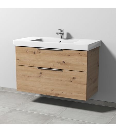 "Sanipa 3way Waschtischunterbau zu Villeroy & Boch Subway 2.0 Waschtisch mit 2 Auszügen, Eiche Natural-Touch, UM61585 3way Das Bad wird zur Bühne - Sie führen Regie beim Spiel mit Formen, Farben und Größen. Drei Waschtisch-Materialien, drei Arten von Schrankmodellen und drei mögliche Griffvarianten bieten viele Lösungen, um die Geschichte zu einem großen Familienbad oder über ein kleines Gäste-WC zu erzählen. Das durchdachte System von 3way macht mit seinen individuellen Details ein großes Werk möglich. Der Applaus gehört Ihnen. Das bietet 3way: Breite Auswahl an Waschtischen in Größe und im Material mit passendem Unterbau im Set Unterbauten zu zahlreichen Waschtischen verschiedener Hersteller wählbar Grifflose Fronten mit seitlicher Griffleiste zum Öffnen und als Designmerkmal, optional klassisch mit Stangengriff Eleganter Aufsatzgriff oder grifflos mit Push to open Technik Praktische Stauraummöbel mit integriertem Wäschekorb oder Ganzkörperspiegel und Regalelemente Einzelne Beimöbel in zwei verschiedenen Tiefen Produktdetails: Eleganter Aufsatz-Griff in Chrom Grifflänge: 33,0 cm Griffplatzierung: oben mittig 2 Metall-Vollauszüge Auszüge mit Selbsteinzug für leichten Lauf und sanftes Schließen Auszüge mit rutschhemmendem Boden Oberer Auszug mit eckigem Siphonausschnitt Innenfarbe Auszüge: Anthrazit Passender Waschtisch: Villeroy & Boch Subway 2.0 Keramik-Waschtisch, Breite 100,0 cm (7175 A0) Zusatzinformationen: Waschtisch nicht im Lieferumfang enthalten, bitte separat bestellen Aufsatz-Griff optional auch in Schwarz-Matt erhältlich Farb- und Strukturabweichungen in den Abbildungen möglich weitere Produktdetails: Breite(cm): 95 Höhe(cm): 59,3 Tiefe(cm): 44,7 Gewicht (kg): 33,12 Material Korpus: Spanplatte Material Front: Spanplatte Material Griff: Metall Oberfläche Korpus: Melamin Oberfläche Front: Melamin Farbe Korpus: Eiche Natural-Touch Farbe Front: Eiche Natural-Touch Farbe Griff: Chrom Griff: mit Griff Öffnungsart: Mit Auszug Montage: Wandmontage Montagezustand: Montiert Lieferumfang: Waschtischunterschrank, Befestigung Einbauart Waschtisch: Für Wandwaschtische Besonderheiten: Beleuchtung: Ohne Beleuchtung Über den Hersteller Sanipa: Das Unternehmen Sanipa mit Sitz im fränkischen Treuchtlingen ist eine hundertprozentige Tochter der Villeroy & Boch AG und zählt zu den renommierten Partnern für den Sanitär-Fachhandel. Sanipa setzt auf Produkte, die in bester Handwerkstradition hergestellt werden und fortschrittliche Technik mit aktuellem Design verbinden. Die Badmöbel sind ""made in Germany"" und können individuell an Kundenwünsche angepasst werden." ...
