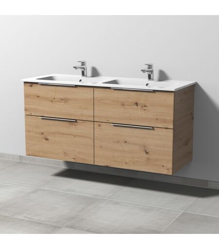 "Sanipa 3way Waschtischunterbau zu Duravit ME by Starck Waschtisch mit 4 Auszügen, Eiche Natural-Touch, UM72885 3way Das Bad wird zur Bühne - Sie führen Regie beim Spiel mit Formen, Farben und Größen. Drei Waschtisch-Materialien, drei Arten von Schrankmodellen und drei mögliche Griffvarianten bieten viele Lösungen, um die Geschichte zu einem großen Familienbad oder über ein kleines Gäste-WC zu erzählen. Das durchdachte System von 3way macht mit seinen individuellen Details ein großes Werk möglich. Der Applaus gehört Ihnen. Das bietet 3way: Breite Auswahl an Waschtischen in Größe und im Material mit passendem Unterbau im Set Unterbauten zu zahlreichen Waschtischen verschiedener Hersteller wählbar Grifflose Fronten mit seitlicher Griffleiste zum Öffnen und als Designmerkmal, optional klassisch mit Stangengriff Eleganter Aufsatzgriff oder grifflos mit Push to open Technik Praktische Stauraummöbel mit integriertem Wäschekorb oder Ganzkörperspiegel und Regalelemente Einzelne Beimöbel in zwei verschiedenen Tiefen Produktdetails: Eleganter Aufsatz-Griff in Chrom Grifflänge: 33,0 cm Griffplatzierung: oben mittig 4 Metall-Vollauszüge Auszüge mit Selbsteinzug für leichten Lauf und sanftes Schließen Auszüge mit rutschhemmendem Boden Obere Auszüge mit eckigem Siphonausschnitt Innenfarbe Auszüge: Anthrazit Passender Waschtisch: Duravit ME by Starck Keramik-Waschtisch, Breite 130,0 cm (2336 13) Zusatzinformationen: Waschtisch nicht im Lieferumfang enthalten, bitte separat bestellen Aufsatz-Griff optional auch in Schwarz-Matt erhältlich Farb- und Strukturabweichungen in den Abbildungen möglich weitere Produktdetails: Breite(cm): 127 Höhe(cm): 61,3 Tiefe(cm): 46,7 Gewicht (kg): 63,48 Material Korpus: Spanplatte Material Front: Spanplatte Material Griff: Metall Oberfläche Korpus: Melamin Oberfläche Front: Melamin Farbe Korpus: Eiche Natural-Touch Farbe Front: Eiche Natural-Touch Farbe Griff: Chrom Griff: mit Griff Öffnungsart: Mit Auszug Montage: Wandmontage Montagezustand: Montiert Lieferumfang: Waschtischunterschrank, Befestigung Einbauart Waschtisch: Für Doppelwaschtische Besonderheiten: Beleuchtung: Ohne Beleuchtung Über den Hersteller Sanipa: Das Unternehmen Sanipa mit Sitz im fränkischen Treuchtlingen ist eine hundertprozentige Tochter der Villeroy & Boch AG und zählt zu den renommierten Partnern für den Sanitär-Fachhandel. Sanipa setzt auf Produkte, die in bester Handwerkstradition hergestellt werden und fortschrittliche Technik mit aktuellem Design verbinden. Die Badmöbel sind ""made in Germany"" und können individuell an Kundenwünsche angepasst werden." ...
