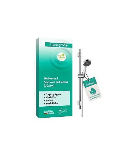 hansgrohe Activera Select S Duschset 28048000Ideal für die Renovierung: Die höhenverstellbare Halterung kann auf vorhandene Bohrlöcher montiert werden (VarioFix)Duschkopf mit 2 traumhaften Strahlarten: aktivierender Rainstrahl und massierender ImpactRainWasser sparen? Mit Vergnügen! Benötigt dank eines flexiblen Durchflussbegrenzers max. 8 l/min (3 bar/EcoSmart)Anpassungsfähige, elastische Düsen im Duschkopf liefern einen kräftigen Brausestrahl (FlexPower)Original Unica Duschstange: mit 0,72 m Länge für flexible Höheneinstellung über einen weiten BereichEinfach eingebaut: der Duschschlauch passt an jeden Standard-WasseranschlussKomfortabel umschalten: Auf Knopfdruck schnell und einfach die gewünschte Strahlart auswählen (Select)5 Jahre freiwillige Herstellergarantie auf ein Produkt, das nach höchsten Qualitätsstandards gefertigt wurdeMit einer Hand: Der Brausehalter lässt sich über eine Taste komfortabel verstellen (PushSlider)Weniger Kalk – mehr Zeit zum Duschen: Ablagerungen an den Düsen werden automatisch ausgespült (QuickClean+)Entspannter duschen: Eine spezielle Befestigung verhindert das lästige Verdrehen des DuschschlauchsLieferumfang: SiebdichtungMontageanleitungBefestigungsmaterialBrausesetIn allen Bestandteilen sind Premium-Materialien verbaut – für mehr Sicherheit und Nachhaltigkeit im Haushalthansgrohe seit 1901 – die Premium-Marke für zuverlässige Bad- und KüchenprodukteErfrischend anders: Activera S Varia spart Wasser bei vollem DuschvergnügenIhr neues hansgrohe Duschset Activera S 95 Varia EcoSmart mit Duschstange (0,72 m) ist ein wahres Wasserwunder! Frisch aus der hansgrohe Strahlforschung glänzt es mit cleveren Ideen für eine kraftvolle und zugleich wassersparende Dusche. Der aktivierende Rain-Strahl macht morgens munter und spendet abends neue Energie. Die Strahlart ImpactRain bezaubert mit einem faszinierenden Wasserbild und bietet ein intensives Duschgefühl.Und das bei weniger Wasserverbrauch: denn hansgrohe EcoSmart verringert den Durchfluss mit einem variablen Begrenzer auf max. 8 l/min – selbst bei hohem Wasserdruck. Dabei begeistert Activera S mit einem überraschend kräftigen Brausestrahl. Flexible Düsen stellen sich dynamisch ein und liefern volles Duschvergnügen (hansgrohe FlexPower). Freuen Sie sich auf aktivierenden Wasserspaß – Tag für Tag.Zum Wohlfühlen schönDesign zum Anfassen: Der ergonomische Griff des Duschkopfs liegt gut in der HandKomfortabel umschalten: Auf Knopfdruck schnell und einfach die gewünschte Strahlart auswählen (Select)Die moderne Form beeindruckt durch ihre harmonische Gestaltung und strahlt Geborgenheit ausEine original hansgrohe Unica-Duschstange (0,72 m) bietet viel KomfortPushSlider: Der Brausehalter lässt sich mit einer Hand drehen und stufenlos verschiebenWeitere BesonderheitenFür vorhandene Bohrlöcher: Die obere Wandstütze ist höhenverstellbar und kann flexibel montiert werden (VarioFix)Entspannter duschen: Eine spezielle Befestigung verhindert das lästige Verdrehen des... ...