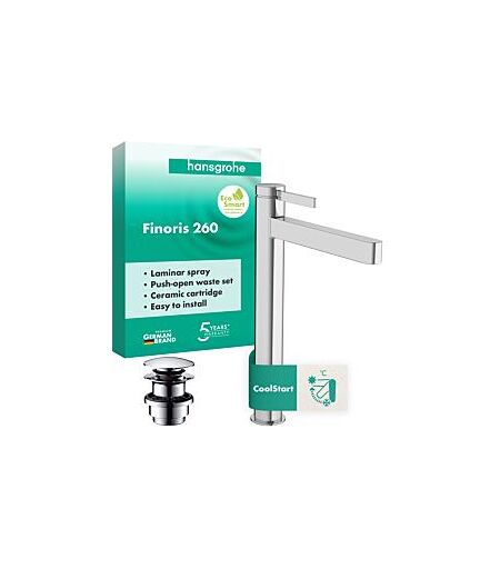 hansgrohe Finoris Einhebel-Waschtischarmatur 76072000Auslaufhöhe 264 mmGriffvariante GebelgriffLaminarstrahlmax. Durchflussmenge bei 3 bar 5 l/minKeramikmischsystemTemperaturbegrenzung einstellbarfür Durchlauferhitzer geeignetAblaufgarniturl MetallAnschlussart G 3/8 AnschlussschläucheAnschlussgröße DN 15EcoSmartKaltwasser in Griff-Grundstellungfür Aufsatzwaschtische geeignet ...