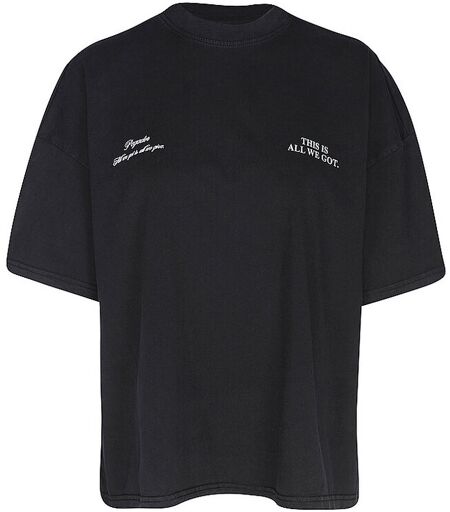 Damen T-Shirt aus reiner Baumwolle Rundhalsausschnitt Halbarm Fallende Schultern Weißer Logo & Text Print auf der Vorder- und Rückseite Artworkprint auf der Rückseite Oversized Fit Farbbezeichnung: Vintage Black Material: 100% Baumwolle ...