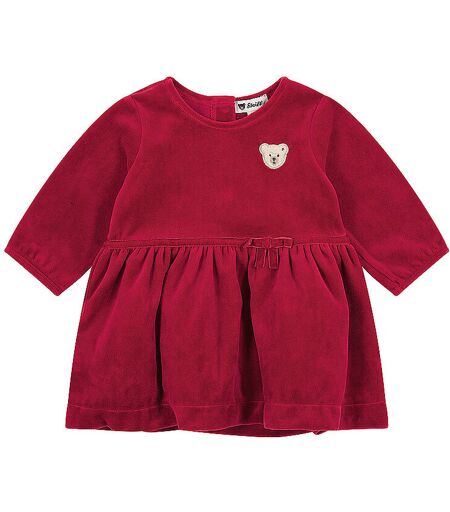Ein kuscheliges Lieblingskleid für kleine Romantikerinnen: Dieses langärmelige Kleid aus weichem Nicky-Velours begeistert mit herrlich samtigem Griff und satter Farbe. Die weit schwingende Silhouette mit sanften Raffungen in der Taille verleiht dem Design eine verspielte Note und lädt zum Wohlfühlen ein. Eine kleine Schleife auf Taillenhöhe setzt einen süßen Akzent. Dank praktischer Druckknöpfe auf der Rückseite gelingt das An- und Ausziehen im Handumdrehen. Auf der Brust rundet das klassische Steiff Teddybärmotiv das Design charmant ab – ein festlicher Wohlfühllook mit Stil und Kuschelfaktor. Farbbezeichnung: Rot Material: 80 % Baumwolle 20 % Polyester ...