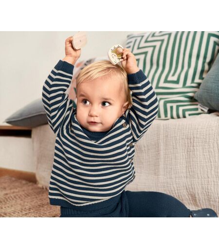 Baby-Strickkombi Farbe: Oberteil dunkelblau-beige getreift Hose dukelblau Material: 100% Baumwolle (aus ökologischem Anbau) Sonstige Hinweise: Größenlauf/Alter: Gr. 50/56 (ca. 0 – 2 M.) Gr. 62/68 (ca. 2 – 6 M.) Gr. 74/80 (ca. 6 – 12 M.) Gr. 86/ 92 (ca. 1 – 2 J.) Gr. 98/104 (ca. 2 – 4 J.) Oberteil mit Knopfleiste an der linken SchulterHose mit elastischem Bund und Saum im 2x2-Rippen-BundWe care for youAus Bio-BaumwolleGOTS zertifiziertDiese Strickkombi schützt Wasserressourcen. ...