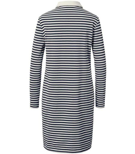 Gestreiftes Sweatkleid mit Polokragen Farbe: Dunkelblau-cremeweiß gestreift Material: 100% Baumwolle Maße: Gesamtlänge ca. 98 cm Passform: Regular Fit Weiche Qualität aus BaumwolleAusschnitt mit KnopfleisteKnieumspielende LängeDieses Kleid unterstützt die Farmer*innen ...