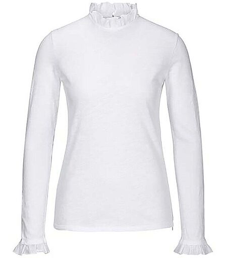 Damen Langarmshirt aus reiner Baumwolle Slub-Jersey-Qualität Stehkragen mit Rüschenbesatz Langarm mit Rüschenabschluss Körpernah geschnitten Unifarben Farbe: White Material: 100% Baumwolle ...