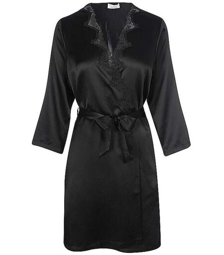 Edel glänzende SeidenqualitätAngenehmes TragegefühlSchalkragenLangarmVerführerische SpitzendetailsStoffgürtelFarbe: SchwarzMaterial: 100% Seide ...