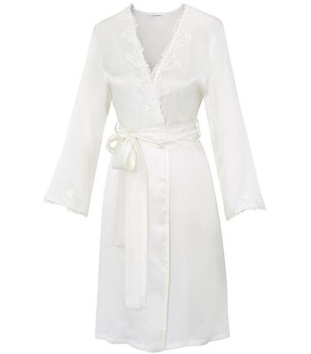 Edel glänzende SeidenqualitätAngenehmes TragegefühlSchalkragenLangarmVerführerische SpitzendetailsStoffgürtelFarbe: IvoryMaterial: 100% Seide ...