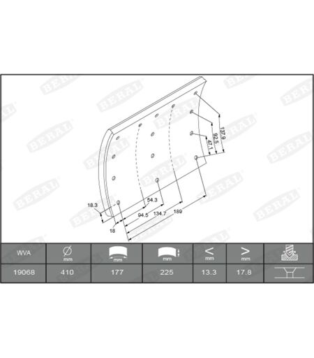 Bohrbild/lochzahl: 12/13. Breite [mm]: 225. Bremsbelag: mit Sichelbelag, Standardmaß. Bremssystem: 5mm Z-Cam = 96xL8, 8mm Z-Cam = 104xL10. Dicke/Stärke [mm]: 20,30. Gewicht [kg]: 9,741. Hersteller: BERAL. Herstellernummer: KBL19068.0-1550. Index: KBL19068.0-1550. Länge außen [mm]: 192. Länge innen [mm]: 176. Nietanzahl pro belagsatz: 96. Nietart: L8/L10. Prüfzeichen: E9-90R-01.876/2261, E9-90R-01.876/2261. Qualität: 1550. Radius [mm]: 200. Trommeldurchmesser: 410. ...