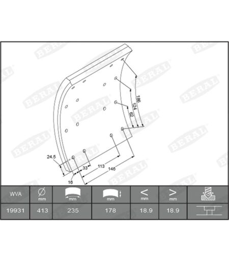 Bohrbild/lochzahl: 16. Breite [mm]: 178. Bremsbelag: 1.Übermaß, 1.Übermaß. Dicke/Stärke [mm]: 20,0. Gewicht [kg]: 7,00. Hersteller: BERAL. Herstellernummer: KBL19931.1-1637. Index: KBL19931.1-1637. Länge außen [mm]: 259. Länge innen [mm]: 235. Nietanzahl pro belagsatz: 64. Nietart: 6.65x18. Prüfzeichen: E9-90R-02.B1058/2770, E9-90R-02.B1058/2770. Qualität: 1637. Radius [mm]: 187. Trommeldurchmesser: 413. ...