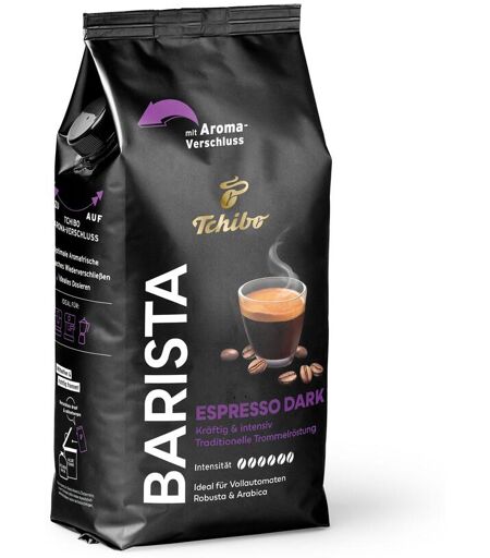BARISTA Espresso Dark - 6 x 1 kg Ganze Bohne Aufbewahrungshinweise: Aromaverpackung, Trocken, dunkel und vor Wärme geschützt lagern., Unter Schutzatmosphäre verpackt. Geschmack > Geschmacksprofil: Kräftig und intensiv Kräftig & intensiv mit feinen Aromen von gerösteten Nüssen sowie einer samtigen, dunklen Crema.Geschmackvoller Kaffee aus aromatischen Tchibo Arabica- und vollmundigen Tchibo Robusta-BohnenMit Aroma-Verschluss für optimale Aromafrische, ideales Dosieren und einfaches WiederverschließenTraditionell und schonend trommelgeröstetIdeal für Kaffeevollautomaten ...