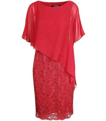 Damen-Kleid aus romantischer Allover-Spitze Fixiertes Cape aus fließendem Chiffon Rundhalsausschnitt Fledermausärmel Körpernahe Passform Knieumspielend Leichtes Futter aus Microfaserjersey Farbbezeichnung: Rot Material: 100% Polyester Futter: 95% Polyester 5% Elasthan ...