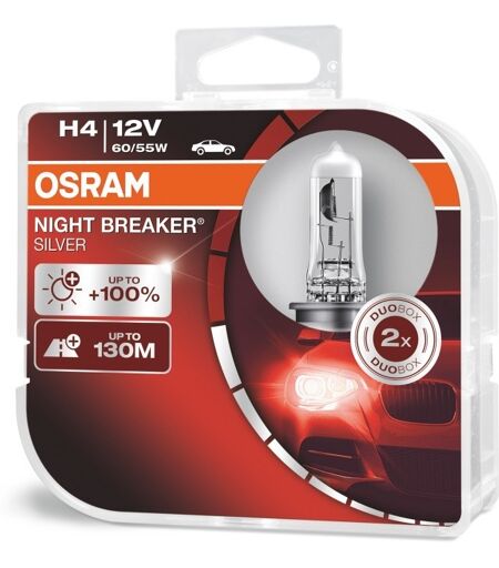 OSRAM NIGHT BREAKER® SILVER H4 Duobox Sockelausführung Glühlampe P43t Spannung [V]:12 V Nennleistung [W]:60/55 W Lampenart H4 ...