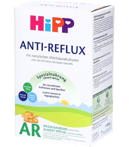 Eine abwechslungsreiche und ausgewogene Ernährung und ein gesunder Lebensstil sind wichtig.HiPP AR Anti-Reflux ist eine eingedickte Spezialnahrung, die von Geburt an für Säuglinge geeignet ist, die unter häufigem Aufstoßen (Regurgitation) leiden. Dank des Johannisbrotkernmehls ist diese Milch besonders cremig und hilft, die Nahrung im Magen zu halten. Sie enthält außerdem natürliche Milchsäurekulturen aus der Muttermilch. Dieses Produkt eignet sich für eine ausgewogene Ernährung im Rahmen einer speziellen Diät nach ärztlichem Rat.Zutaten Maisstärke, Magermilch, pflanzliche Öle (Palmöl*, Rapsöl*, Sonnenblumenöl*), teilentmineralisiertes Süßmolkenpulver, Laktose, Johannisbrotkernmehl (2,0 %), Calciumcarbonat, Kaliumchlorid, Magnesiumchlorid, Natriumchlorid, Kaliumcitrat, natriumcitrat, Eisensulfat, Zinksulfat, Cholinchlorid, L-Phenylalanin, L-Tryptophan, L-Isoleucin, L-Cystin, Ascorbinsäure, Calciumpantothenat, Nicotinamid, Kupfersulfat, Riboflavin, Thiaminhydrochlorid, Retinol, Folsäure, Kaliumiodid, Natriumselenat, Phyllochinon, Cholecalciferol, D-Biotin, Cyanocobalamin.*aus kontrolliert biologischem AnbauNährwertangaben Für 100 ml zubereitetFür 100 g Pulver Energie275 kJ / 66 kcal2125 kJ / 509 kcal Fett3,4 g27,0 g davon gesättigt1,5 g13,2 g Kohlenhydrate6,9 g53,8 g davon Zucker3,8 g29,6 g Nahrungsfasern0,3 g2,3 g Eiweiß1,3 g10,2 g Salz0,05 g0,4 g Calcium53 mg420 mg Eisen0,8 mg6,2 mg Vitamin A54 µg417 µg Vitamin D1,4 µg11 µg Vitamin C10 mg77 mg Andere Mineralien & Vitaminesiehe Verpackung Anwendungsempfehlungen Wasser zum Kochen bringen, auf ~40-50 °C abkühlen lassen Benötigte Menge in die Flasche geben Entsprechende Anzahl gestrichener Messlöffel hinzufügen Flasche gut schütteln, bis sie sich vollständig aufgelöst hat Kurz stehen lassen, damit die Milch eindickt Beispiel für die Dosierung : 150 ml Wasser + 5 Messlöffel = 170 ml rekonstituierte MilchVorsichtsmaßnahmen für die Anwendung Nur unter ärztlicher Aufsicht verwenden. Nicht einfrieren. Nach dem Öffnen trocken lagern und innerhalb von 3 Wochen aufbrauchen.Nettogewicht600 gHerstellerHiPP GmbH & Co. Vertrieb KGD-85273 PfaffenhofenDeutschland ...