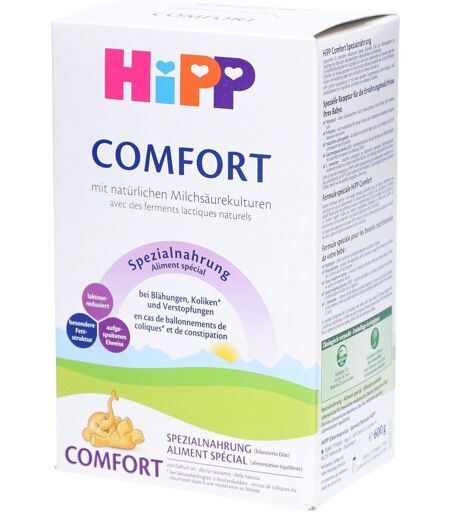 Bitte achten Sie auf eine abwechslungsreiche und ausgewogene Ernährung und gesunde Lebensweise. HiPP Comfort ist eine Spezialnahrung für Babys mit Verdauungsproblemen wie Blähungen, Koliken und Verstopfung. Sie enthält aufgespaltenes Eiweiß, eine laktosereduzierte Formel, einen angepassten Fettgehalt und natürliche Milchsäurekulturen zur Unterstützung der Darmflora. Geeignet zur diätetischen Behandlung von Unverträglichkeiten in den ersten Lebensmonaten. Zutaten: Lactose (aus Milch), pflanzliche Öle (Palmöl, Rapsöl, Sonnenblumenöl), Galactooligosaccharide (aus Milch), hydrolysiertes Molkenprotein (aus Milch), Stärke, Milchsäurebakterienkultur (Lactobacillus fermentum CECT5716), Mineralstoffe (Calciumcarbonat, Kaliumchlorid, Kaliumdihydrogenphosphat, Magnesiumchlorid, Magnesiumoxid, Eisensulfat, Zinksulfat, Kupfersulfat, Mangansulfat, Kaliumiodid, Natriumselenat), Emulgator: Sojalecithin; L-Tyrosin, L-Tryptophan, L-Phenylalanin, Vitamine (C, Niacin, E, Pantothensäure, B1, B6, A, Folsäure, K, Biotin, D, B12), Fischöl, Öl aus Mortierella alpina, L-Carnitin, Inositol. Nährwertangaben: Nährwertangaben Nährwert Menge Pro 100 ml Energie276 kJ / 66 kcal Fett3.4 g davon gesättigte Fettsäuren1.4 g Kohlenhydrate7.0 g davon Zucker (Lactose)2.3 g Eiweiß1.25 g Ballaststoffe (GOS)0.3 g Natrium23 mg Vitamin A53 µg Vitamin D1.3 µg Vitamin E1.0 mg Vitamin C8.6 mg Vitamin B120.17 µg Calcium53 mg Eisen0.8 mg Zink0.5 mg Verzehrempfehlung: Die Zubereitung erfolgt gemäß den Dosier- und Hygienehinweisen auf der Verpackung. Alters- und bedarfsgerecht füttern. Hinweise & Aufbewahrung: Nur unter ärztlicher Aufsicht verwenden. Produkt trocken und kühl lagern. Nach dem Öffnen innerhalb weniger Wochen verbrauchen. Nettofüllmenge: 600 g (ergibt ca. 47 Portionen à 100 ml) Hersteller: HiPP GmbH & Co. Vertrieb KG D-85276 Pfaffenhofen Deutschland ...