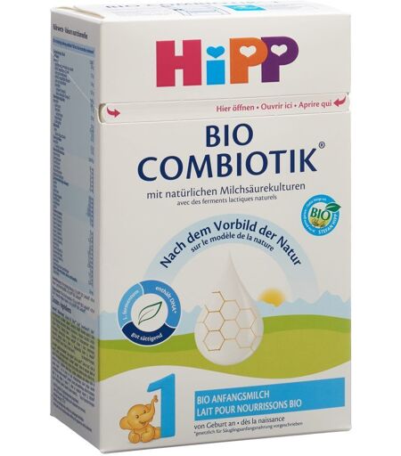 Nahrungsergänzung zur Verwendung im Rahmen einer abwechslungsreichen, ausgewogenen Ernährung und eines gesunden Lebensstils.Große Sorgfalt und Erfahrung - für das Wertvollste auf der Welt HiPP BIO COMBIOTIK* ist unsere neueste Generation von Säuglingsmilch, die aus sorgfältig ausgewählten BIO-Zutaten und unserer einzigartigen Kombination wertvoller Nährstoffe nach dem Vorbild der Natur hergestellt wird. Die einzigartige Rezeptur von HiPP BIO COMBIOTIK' Als ausschließliche Ernährung ab der Geburt, wenn das Baby nicht gestillt werden kann, oder als Ergänzung zur Muttermilch Im Anschluss an eine PRE BIO COMBIOTlK' oder eine andere Säuglingsmilch.- Enthält DHA (wie vom Gesetzgeber für Säuglingsanfangsnahrung gefordert). - L. fermentum: Natürliche Milchsäurebakterien, die ursprünglich aus Muttermilch gewonnen werden.Milch enthält eine Vielzahl natürlicher Milchsäurebakterien, die von Mensch zu Mensch unterschiedlich sind. HIPP 1 BIO COMBIOTIK' enthält im Gegensatz zu HIPP PRE COMBIOTIK' eine Stärke, die dank Galactooligosaccharid (GOS) den Stuhlgang wie beim Stillen erleichtert. Achten Sie auf eine ausgewogene und abwechslungsreiche Ernährung und eine gesunde Lebensweise.ZutatenMILCH Magermilch*, ERZEUGNIS MILCHIER, pflanzliche Öle* (Palmöl*+, Rapsöl*, Sonnenblumenöl*), Stärke*, galactooligosaccharide* aus Laktose*, Laktose*, Kaliumchlorid, FISCHÖL(2), Öl aus Mortierella alpina, Cholin, L-Tyrosin, Natriumcitrat, Natriumselenit, Zinksulfat, Calciumcarbonat, L-Tryptophan, Eisensulfat, L-Histidin, Kaliumjodat, Vitamin C, Calciumsalze der Orthophosphorsäure, natürliche Milchsäurekultur (Limosilactobacillus fermentum hereditum(3)), Vitamin E, Niacin, pantothensäure, Mangansulfat, Kupfersulfat, Vitamin A, Vitamin B1, Magnesiumcarbonat, Vitamin B6, Metafolin (Calcium-L-Methylfolat)4, Vitamin K, Vitamin D, Biotin, Vitamin B12. *aus ökologischer/biologischer Produktion. (2)Enthält DHA (für Säuglingsanfangsnahrung gesetzlich vorgeschrieben). (3)Limosilactobacillus fermentum CECT5716Allergene: Fisch, Milch.Nährwertangaben Pro 100 mlEnergiegehalt (in kj) 278 KJEnergiegehalt (in kcal) 67 KcalFett 3.6 gGesättigte Fettsäuren 1.5 gKohlenhydrate 7.1 gDavon Zucker 5.9 gProteine 1.3 gAnwendungsempfehlungenAlterBabyfläschchen pro TagMilchmengeKochendes WasserMesslöffel1-2 Wochen*7-870 ml60 ml23-4 Wochen5-7100 ml90 ml35-8 Wochen5-6135 ml120 ml43-4 Monate5170 ml150 ml5 5 Monate** 4-5200 ml180 ml6ab 6 Monaten4235 ml210 ml7*Soweit Ihr Kinderarzt keine Gegenanzeige stellt. **Nach Rücksprache mit Ihrem Kinderarzt können Sie bereits mit 5 Monaten mit der Diversifizierung der Ernährung beginnen.Vorsichtsmaßnahmen für die Anwendung Beachten Sie immer die Zubereitungs- und Dosierungsanleitung auf der Packung. Unsachgemäße Zubereitung und Lagerung können der Gesundheit Ihres Kindes schaden, indem sie das Wachstum schädlicher Keime begünstigen. Bereiten Sie vor jedem Füttern ein neues Fläschchen vor und geben Sie es Ihrem Kind sofort. Werfen Sie die Reste einer unfertigen... ...