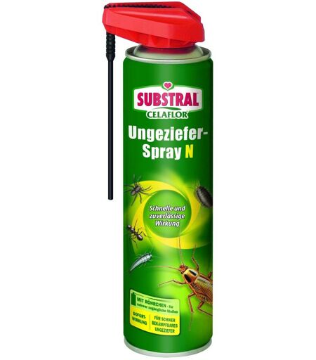 Substral Ungezieferspray400 ml Produktnummer: 0688501609 Substral Celaflor Ungeziefer-Spray N ist ein Kontakt-Spray zur akuten Bekämpfung von Ungeziefer (Schaben, Kellerasseln, Ameisen, Spinnen, Silberfischchen und andere Insekten) im Haus, auf Terrassen und Balkonen. Anwendung: In und am Haus (Wohnräume, Balkone, Terrassen, Gartenhäuser usw.) gegen Ungeziefer (Schaben, Kellerasseln, Ameisen, Spinnen, Silberfischchen und andere Insekten) Wirkstoff: 0,5 g/kg (0,05 Gew.%) Chrysanthemum-cinerariaefolium-Extrakt aus offenen und reifen Tanacetum-cinerariifolium-Blüten, mit Kohlenwasserstoff-Lösungsmittel gewonnen; 1,5 g/kg (0,15 Gew.%) Piperonylbutoxid/ PBO Inhalt: 400ml Kontaktspray Schnelle und zuverlässige Wirkung Mit Röhrchen für schwer zugängliche Stellen, wie Ritzen und Fugen Gegen schwer bekämpfbares Ungeziefer im Haus, auf Terrassen und Balkonen Mit Sofort - und Langzeitwirkung Mit Sofort - und Langzeitwirkung Herstellerinformationen: Evergreen Garden Care Deutschland GmbH Am Brand 41 55116 Mainz, Deutschland eMail: info-de@evergreengarden.com Herstellernr. 13461 Verbraucherhinweise Gefahrenhinweise Extrem entzündbares Aerosol.Giftig für Wasserorganismen, mit langfristiger Wirkung.Behälter steht unter Druck: Kann bei Erwärmung bersten. Sicherheitshinweise Inhalt/Behälter einer Sammelstelle für gefährliche oder spezielle Abfälle, in Übereinstimmung mit lokalen, regionalen, nationalen und/oder internationalen Vorschriften zuführen.Lesen Sie sämtliche Anweisungen aufmerksam und befolgen Sie diese.Von Hitze, heißen Oberflächen, Funken, offenen Flammen sowie anderen Zündquellenarten fernhalten. Nicht rauchen.Nicht gegen offene Flamme oder andere Zündquelle sprühen.Darf nicht in die Hände von Kindern gelangen.Vor Sonnenbestrahlung schützen und nicht Temperaturen über 50 °C/122 °F aussetzen.Nicht durchstechen oder verbrennen, auch nicht nach Gebrauch.Verschüttete Mengen aufnehmen.Freisetzung in die Umwelt vermeiden. Hinweis: Biozidprodukte vorsichtig verwenden. Vor Gebrauch stets Etikett und Produktinformation lesen. Biozid Registrier-/Zulassungsnummer: N-76342 ...
