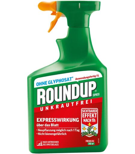 Roundup Unkrautfrei Express Spray 1 L Produktnummer: 0688501606 Roundup Unkrautfrei Express ist ein anwendungsfertiges Spray und bekämpft schnell und wirksam einjährige zweikeimblättrige Unkräuter und Ungräser in Beeten und auf unbefestigten Gartenwegen. Da es nur auf grüne, nicht verholzte Pflanzen und Pflanzenteile wirkt, können Unkräuter unter Bäumen und Sträuchern bekämpft werden. Je nach Witterung ist die Wirkung bereits innerhalb einer Stunde sichtbar. Auch alle grünen, oberirdischen Pflanzenteile von mehrjährigen Unkräutern werden geschädigt. Anwendung durch nichtberufliche Anwender zulässig. Detaillierte Anwendungs- und Kennzeichnungshinweise: siehe Innenseite! Biologisch abbaubar: der Wirkstoff wird im Boden durch Mikroorganismen zersetzt. WIRKUNGSPEKTRUM: Das Mittel wirkt gegen die meisten Gartenunkräuter im Jugendstadium, wie zum Beispiel Hopfenklee (Medicago lupulina), Ehrenpreis (Veronica-Arten), einjährige Brennnessel (Urtica), Weißer Gänsefuß (Chenopodium album), Gemeines Kreuzkraut (Senecio vulgaris), Vogelmiere (Stellaria media), Schwarzer Nachtschatten (Solanum nigrum), Gänsedistel (Sonchus-Arten), Schwarzer Senf (Brassica nigra), Gewöhnliches Bitterkraut (Picris hieracioides), Weidenröschen (Epilobium-Arten), Hirtentäschel (Capesella bursa-pastoris), Kanadisches Berufkraut (Erigeron canadensis), Gewöhnlicher Erdrauch (Fumaria officinalis), Franzosenkraut, Taubnessel-Arten (Lamium species), Acker-Spörgel (Spergula arvensis), Einjährige Rispe (pfla annua). Weniger gut bekämpfbar: Acker-Schachtelhalm (Equisetum arvense), Strahlenlose Kamille (Matricaria discoidea) oder Echte Strandkamille (Matricaria maritima). Nicht ausreichend bekämpfbar: Echte Kamille (Matricaria chamomilla), Spitzwegerich (pflantago lanceolata), Wintergerste (Hordeum vulgare) oder Stumpfblättriger Ampfer (Rumex obtusifolius). Mehrjährige Unkräuter wie zum Beispiel Löwenzahn, Klee, Wegericharten oder Schachtelhalm werden nur im Jugendstadium erfasst, sind daher nicht nachhaltig bekämpfbar (Wiederaustrieb möglich). Hinweis: Bitte Käuferinformationsblatt zu Pflanzenschutzmittel beachten! Anwendungszeitraum: April bis September Unkrautbekämpfung mit schnell sichtbarer Wirkung bereits nach 1 Stunde Expresswirkung über das Blatt der Pflanzen - ohne Glyphosat Gegen ein- und zweikeimblättrige Unkräuter und Gräser auf Wegen und Plätzen mit Holzgewächsen, unter Obstgehölzen und Ziergehölzen Kinder und Haustiere dürfen nach Antrocknen des Spritzbelages wieder auf die behandelte Fläche Nicht bienengefährlich Achtung! Pflanzenschutzmittel vorsichtig verwenden. Vor Verwendung stets Etikett und Produktinformationen lesen. Verbraucherhinweise Gefahrenhinweise Zur Vermeidung von Risiken für Mensch und Umwelt die Gebrauchsanleitung einhalten.Enthält Reaktionsmasse aus 5-Chlor-2-methyl-2H-isothiazol-3-on und 2-Methyl-2H-isothiazol-3-on (3:1). Kann allergische Reaktionen hervorrufen. Sicherheitshinweise Lesen Sie sämtliche Anweisungen aufmerksam und befolgen Sie diese.Darf... ...
