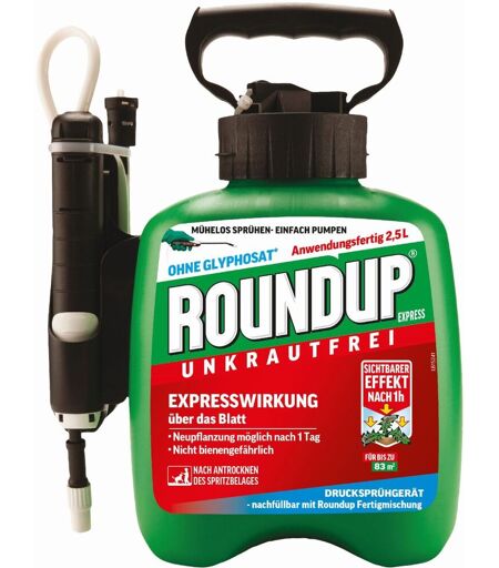 Roundup Express Drucksprühgerät - 2,5 Liter Produktnummer: 0688501555 Roundup Unkrautfrei Express ist ein anwendungsfertiges Spray und bekämpft schnell und wirksam einjährige zweikeimblättrige Unkräuter und Ungräser in Beeten und auf unbefestigten Gartenwegen mit Holzgewächsen. Da es nur auf grüne, nicht verholzte Pflanzen und Pflanzenteile wirkt, können Unkräuter unter Bäumen und Sträuchern bekämpft werden. Je nach Witterung ist die Wirkung bereits innerhalb einer Stunde sichtbar. Auch alle grünen, oberirdischen Pflanzenteile von mehrjährigen Unkräutern werden geschädigt. Anwendung durch nichtberufliche Anwender zulässig. Detaillierte Anwendungs- und Kennzeichnungshinweise: siehe Innenseite! Biologisch abbaubar: der Wirkstoff wird im Boden durch Mikroorganismen zersetzt. Von der Zulassungsbehörde festgesetzte Anwendungsgebiete u. -bestimmungen: - Anwendungsart/Anwendungsmenge: Fertigpräparat, 30 ml /m² spritzen (bei Ziergehölzen unter bzw. zwischen den Kulturpflanzen). - Schadorganismus/Zweckbestimmung: Einkeimblättrige Unkräuter, Einjährige zweikeimblättrige Unkräuter. - Kulturen: Wege und Plätze mit Holzgewächsen, Ziergehölze - Einsatzgebiet und Anwendungsbereich: Zierpflanzenbau, Haus- und Kleingartenbereich; Freiland - Anwendungszeitpunkt: Ab Frühjahr, bis 10 cm Unkrauthöhe. - Anwendungstechnik: Spritzen, Einzelpflanzenbehandlung / unverdünnt. Max. 4 Anwendungen pro Kultur bzw. je Jahr im zeitlichen Abstand von mindestens 7 Tagen. Die Festsetzung einer Wartezeit ist ohne Bedeutung. Das Mittel besitzt keine nachhhaltige Wirkung. WIRKUNGSPEKTRUM: Das Mittel wirkt gegen die meisten Gartenunkräuter, wie zum Beispiel Hopfenklee (Medicago lupulina), Ehrenpreis (Veronica-Arten), einjährige Brennnessel (Urtica), Weißer Gänsefuß (Chenopodium album), Gemeines Kreuzkraut (Senecio vulgaris), Vogelmiere (Stellaria media), Schwarzer Nachtschatten (Solanum nigrum), Gänsedistel (Sonchus-Arten), Schwarzer Senf (Brassica nigra), Gewöhnliches Bitterkraut (Picris hieracioides), Weidenröschen (Epilobium-Arten), Hirtentäschel (Capesella bursa-pastoris), Kanadisches Berufkraut (Erigeron canadensis), Gewöhnlicher Erdrauch (Fumaria officinalis), Franzosenkraut, Taubnessel-Arten (Lamium species), Acker-Spörgel (Spergula arvensis), Einjährige Rispe (pfla annua). Weniger gut bekämpfbar: Acker-Schachtelhalm (Equisetum arvense), Strahlenlose Kamille (Matricaria discoidea) oder Echte Strandkamille (Matricaria maritima). Nicht ausreichend bekämpfbar: Echte Kamille (Matricaria chamomilla), Spitzwegerich (pflantago lanceolata), Wintergerste (Hordeum vulgare) oder Stumpfblättriger Ampfer (Rumex obtusifolius). Mehrjährige Unkräuter wie zum Beispiel Löwenzahn, Klee, Wegericharten oder Schachtelhalm werden nur im Jugendstadium erfasst, sind daher nicht nachhaltig bekämpfbar bzw. müssen eventuell weitere Male behandelt werden (Wiederaustrieb möglich). Hinweis: Bitte Käuferinformationsblatt zu Pflanzenschutzmittel beachten! Anwendungszeitraum: April bis September... ...