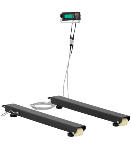 Nicht jeder Gegenstand hat die optimale Form für eine Bodenwaage. Mit den Wiegebalken von Steinberg Systems können Sie die Wiegefläche an den Gegenstand anpassen, seien es Paletten in Sondergrößen, Baumstämme oder andere ungleichmäßige Objekte. Dadurch entspricht die Balkenwaage den speziellen Anforderungen im Handel, in der Industrie oder Forst-, wie Landwirtschaft. Durch das separate LCD-Display kann die Schwerlastwaage dabei besonders flexibel eingesetzt werden. Die Digitalwaage von Steinberg Systems misst auf 1 kg genau. Die gemessenen Werte lesen Sie bequem am externen LCD-Display ab. Wählen Sie zwischen den Einheiten kg und lb. Das Display ist mit einem 5 m langen Kabel verbunden. Dank der integrierten Griffe und Rollen transportieren Sie die Industriewaage mühelos an ihren Einsatzort. Die mobile Waage wird über AAA-Batterien betrieben. Dabei zeigt sie mit einer Laufzeit von bis zu 20 h eine erstaunliche Ausdauer. Nach 180 s Inaktivität schaltet das Gerät automatisch ab. Die Wiegebalken habe die Maße 1000 x 100 mm und bestehen aus robustem Karbonstahl. Je nach Position auf dem Boden können Sie die Wiegefläche erhöhen oder verringern. Über Schnellanschlüsse können Sie mit dem Display verbunden werden. Zum Messen haben Sie die Funktionen Halten und dynamisches Wiegen. ...