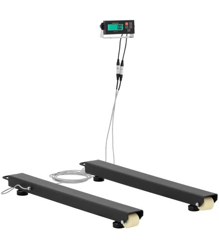 Nicht jeder Gegenstand hat die optimale Form für eine Bodenwaage. Mit den Wiegebalken von Steinberg Systems können Sie die Wiegefläche an den Gegenstand anpassen, seien es Paletten in Sondergrößen, Baumstämme oder andere ungleichmäßige Objekte. Dadurch entspricht die Balkenwaage den speziellen Anforderungen im Handel, in der Industrie oder Forst-, wie Landwirtschaft. Durch das separate LCD-Display kann die Schwerlastwaage dabei besonders flexibel eingesetzt werden. Die Digitalwaage von Steinberg Systems misst auf 0,5 kg genau. Die gemessenen Werte lesen Sie bequem am externen LCD-Display ab. Wählen Sie zwischen den Einheiten kg und lb. Das Display ist mit einem 5 m langen Kabel verbunden. Dank der integrierten Griffe und Rollen transportieren Sie die Industriewaage mühelos an ihren Einsatzort. Die mobile Waage wird über AAA-Batterien betrieben. Dabei zeigt sie mit einer Laufzeit von bis zu 20 h eine erstaunliche Ausdauer. Nach 180 s Inaktivität schaltet das Gerät automatisch ab. Die Wiegebalken habe die Maße 1000 x 100 mm und bestehen aus robustem Karbonstahl. Je nach Position auf dem Boden können Sie die Wiegefläche erhöhen oder verringern. Über Schnellanschlüsse können Sie mit dem Display verbunden werden. Zum Messen haben Sie die Funktionen Halten und dynamisches Wiegen. ...