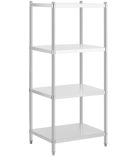 Ob Gastronomie, Hotel, Supermarkt oder Zuhause, das Edelstahlregal RCER-8060 von Royal Catering ist ein Muss für jeden Lagerraum. Das hygienische und stabile Regal eignet sich zum Lagern verschiedenster Dinge, von Lebensmitteln bis hin zu Werkzeugen und hält dabei hohen Lasten stand. Ob professioneller oder privater Gebrauch, das Edelstahlregal ist perfekt für Sie! Das Küchenregal hat die Maße 80 x 60 x 180 cm und eignet sich daher optimal für Gastroküchen oder Lagerräume. Dank einer Traglast von 50 kg pro Boden können viele Utensilien gleichzeitig gelagert werden. Insgesamt besitzt das Gastroregal 4 Böden. Dank seiner Konstruktion aus Edelstahl ist das Schwerlastregal nicht nur extrem stabil und langlebig, sondern auch besonders pflegeleicht. Edelstahl ist korrosionsbeständig und kann einfach gereinigt werden. Zudem entspricht es dem höchsten Gastronomiestandard, wodurch die Lagerung von Lebensmitteln kein Problem darstellt. Die silberne Farbe verleiht dem Lagerregal einen besonders edlen Look und eignet sich für den Gebrauch in allen möglichen Bereichen, von Gastronomie über Hotels bis hin zu privaten Räumlichkeiten. Das Edelstahlregal ist kinderleicht aufzubauen, es werden keine weiteren Werkzeuge benötigt. ...