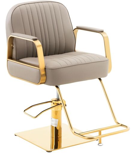 Schaffen Sie für Ihre Kundschaft einen angenehmen Platz mit dem Friseurstuhl Staunton Beige und sorgen Sie für einen stilvollen Akzent in Ihrem Salon. Das dezente Design in Beige und Goldfarben fügt sich in jede Umgebung ein. Der Friseurstuhl mit Fußstütze und gepolsterter Rückenlehne wird Sie und Ihre Gäste durch maximalen Komfort begeistern – ob im Friseursalon, im Tattoo- oder Kosmetikstudio. Auf dem ergonomischen Friseurstuhl sitzt Ihre Kundschaft äußerst bequem. Dafür sorgen die hohen Armlehnen sowie der hochwertige Schaumstoff, welcher als Polsterung dient. Er ist weich und formbeständig. Den langlebigen Kunstlederbezug reinigen Sie spielend leicht, darüber hinaus überzeugt er durch staub- und wasserabweisende Eigenschaften. Den Friseurstuhl stellen Sie mühelos mit einer Hydraulikpumpe zwischen 520 - 920 mm in der Höhe ein. Zusätzlich drehen Sie den Stuhl einfach in die Position, aus der heraus Sie am besten arbeiten. So erreichen Sie mit wenigen Handgriffen immer eine optimale Arbeitsposition, die Sie auch an langen Tagen nicht ermüden lässt. Das Gestell des Friseursessels besteht aus robustem wie eleganten Edelstahl. Die stabile Konstruktion trägt sicher eine Last von 200 kg und verleiht dem Stuhl Halt sowie eine hohe Langlebigkeit. Für zusätzliche Stabilität sorgt der große Standfuß 45 x 45 cm. Die vergoldeten Edelstahloberflächen unterstreichen das stilvolle Design. ...
