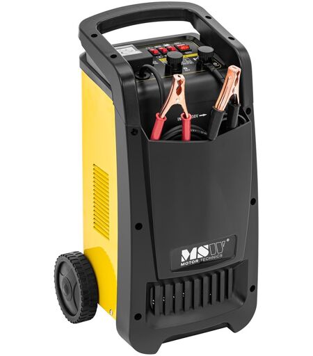 Wer kennt das nicht? Sie sind viel unterwegs, aber nur auf kurzen Stecken unter fünf Minuten. Gerade im Winter macht da schnell die Batterie nicht mehr mit. Mit der professionellen wie kompakten Autobatterie von MSW leisten Sie schnell und unkompliziert Starthilfe, damit Ihr Kfz wieder in Fahrt kommt. Besser noch, Sie lassen es nicht so weit kommen und laden Ihre Autobatterie auf, wenn sie anfängt, in der Leistung nachzulassen. Ob beim Startvorgang für Benziner oder beim Vorglühen eines Dieselmotors, mit dem Jump Starter sind Sie für alle Fälle gerüstet. Das Ladegerät mit einem maximalen Startstrom von 320 A sorgt zuverlässig dafür, dass der Motor selbst bei einer leeren Autobatterie schnell wieder anspringt. Gerade in der Kfz-Werkstatt, wo der Motor öfters nur für kurze Zeit gestartet wird, hat die Batterie kaum eine Chance, vernünftig zu laden. Mit dem Gerät bekommen Sie eine schnelle Starthilfe, die bei dem Vorgang maximal 8000 W verbraucht. Mit dem Ladegerät laden Sie zuverlässig Autobatterien mit einer Nennkapazität von 40 - 700 Ah auf. Dabei erreicht es mit 70 A besonders schnelle Ladezeiten. Mit einer Ausgangsspannung von 12 V oder 24 V setzen Sie das Gerät auch für die notwendigen Spannungen bei größeren Fahrzeugen wie Lastkraftwägen ein. So dauert es nicht lange, bis die Batterie nach dem Laden wieder einsatzbereit ist. Prüfen Sie vor dem Laden stets, ob Ihre Batterie der empfohlenen Batteriekapazität entspricht. Sie steuern die Ladeleistung nutzerfreundlich über einen Schalter in nur zwei Stufen: MIN für normal entladene Batterien, MAX für tiefentladene Batterien am unteren Limit. Je nachdem, ob die Batterie durch viele Kurzstreckenfahrten nur geschwächt ist oder durch stromfressende Extras wie Scheiben- oder Sitzheizungen nahezu entladen ist, mit den Stufen MIN oder MAX sind Sie auf jede Ladesituation vorbereitet. Dank der eingebauten Sicherung ist es vor Kurzschlüssen geschützt, sollten Sie die Kabel einmal falsch gepolt anschließen. Das Kfz-Ladegerät überzeugt nicht nur durch seine kompakte Konstruktion, sondern auch durch zahlreiche sinnvolle Details. Nutzen Sie spezielle Taschen, um die langen Verbindungskabel zu verstauen und für Ordnung in Ihrer Werkstatt zu sorgen. Dank der Räder und einem passenden Griff transportieren Sie das Batterieladegerät leicht von einem Auto zum nächsten. Oder setzen Sie das Gerät mit dem robusten Griff einfach um. ...