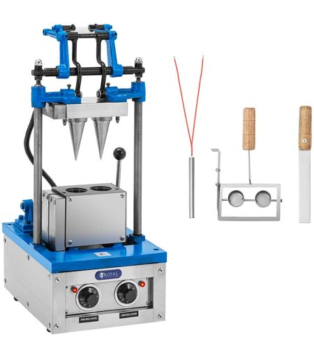 Sie servieren Eiswaffeln am laufenden Band? Dann ist die Eiswaffelmaschine von Royal Catering die ideale Ergänzung für Ihren Betrieb. Mit ihr backen Sie 2 identische Eiswaffeln in 1 - 2 min. Ob für die Eisdiele, ein Café oder die Großküche – mit der Eiswaffelmaschine sichern Sie sich Eistüten nach Ihrem eigenen Rezept zu jeder Zeit! Den Hörnchenautomaten bedienen Sie ganz einfach: An den übersichtlichen Thermostaten stellen Sie die gewünschte Temperatur für die obere und untere Backplatte separat ein. Füllen Sie die Formen der unteren Backformen mit dem vorgefertigten Teig. Drücken Sie anschließend den oberen Teil mit Hilfe des handlichen Hebels herunter. Der Eiswaffelautomat arbeitet mit starken 2100 W. Die hohe Leistung beschleunigt den Backvorgang, sodass die Hörnchen in nur 60 - 120 s ausbacken. Nach dem Backen trennen Sie die unteren Backplatten per Hebel auf, sodass die fertigen Hörnchen in einen Behälter fallen. Bei 2 Hörnchen in einem Durchgang erreichen Sie einen Durchlauf von 50 - 60 knusprigen Waffeln in der Stunde. Ihre Vorteile: Die Eistüten sind alle perfekt ausgeformt und haben dieselbe Form, bei jedem Backvorgang. Außerdem bestimmen Sie selbst, welche Zutaten in den Waffelteig wandern. Die Waffelhörnchen-Maschine ist hochwertig verarbeitet, sodass sie robust und für den regelmäßigen Betrieb geeignet ist. Sie bedienen sie zudem einfach und reinigen sie im Handumdrehen. Teigreste fegen Sie einfach von den gut zugänglichen Backplatten ab. ...