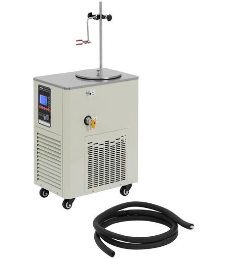 Der Umlaufkühler von Steinberg Systems ist die leistungsstarke Lösung für vielfältige Kühlaufgaben in Labor oder Industrie. Sie verwenden ihn, um Präzisionsgeräte wie Rotationsverdampfer auf einer vorgegebenen Temperatur zu halten oder die Hitzeentwicklung bei Lasern zu reduzieren. Dank kurzer Abkühlzeiten und eines hohen Wirkungsgrads ist der Flüssigkeitskühler mit geschlossener Kompressorkühlung und intelligentem Steuerungssystem eine effiziente und kostensparende Alternative zur Kühlung mit Leitungswasser. Der Laborkühler überzeugt durch eine hohe Genauigkeit von 0,2 °C. Über das intuitive Bedienfeld mit LC-Display haben Sie alle Werte im Blick. Der über einen Mikroprozessor gesteuerte PID-Regler garantiert die Präzision der eingestellten Temperatur von -20 - 99 °C. Eine schnelle und zuverlässige Kühlleistung stellt der integrierte Kompressor sicher, der mit dem umweltverträglichen Kühlmittel R290 arbeitet. Dank einer Umlaufgeschwindigkeit von 20 l/min ermöglicht der Kreislaufkühler eine zuverlässige und gleichmäßige Kühlung aller angeschlossenen Geräte. Der Umlaufkühler ist aus Edelstahl und verzinktem Stahlblech gefertigt. Dieser Materialmix ist besonders korrosionsbeständig und daher optimal für die Verwendung im Labor oder anderen Umgebungen geeignet, in denen Flüssigkeiten eingesetzt werden. Zudem ist das Gerät vor Überhitzung oder Überstrom geschützt. Insgesamt erweist sich der Umwälzkühler als äußerst langlebig und zuverlässig im täglichen Betrieb. Der Laborkühler benötigt dank des kompakten Designs nur eine geringe Stellfläche, sodass Sie ihn auch auf kleinen Arbeitsflächen platzsparend verwenden. Er ist optimal für den Einsatz in Laboren der Medizin, des Gesundheitswesens, der chemischen Industrie oder der industriellen Fertigung von Lebensmitteln geeignet. Überall überzeugt er durch erstklassige, kühlende Eigenschaften bei sehr ruhigem Betrieb. ...