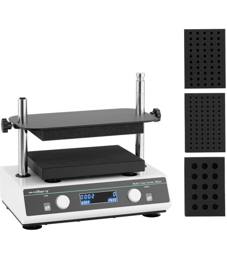 Sie wollen in Ihrem Labor Flüssigkeiten in vielen Röhrchen gleichzeitig vermischen? Dann ist der Vortex Mixer das optimale Laborgerät für Sie. Es mischt schnell wie präzise eine große Anzahl an Röhrchen und bietet Ihnen dadurch in kürzester Zeit die Ergebnisse, die Sie benötigen. Dabei erweist sich der kompakte Mixer als äußerst standfest und findet auf jedem Labortisch seinen Platz. Der Vortex-Schüttler überzeugt durch eine präzise wie einfache Handhabung. Mithilfe von drehbaren Druckknöpfen stellen Sie den Timer wie die Geschwindigkeit ein und aktivieren die von Ihnen gewünschten Werte. Dabei haben Sie auf dem großen LCD alle Parameter jederzeit im Blick. Der Timer bietet eine Zeitspanne von 1 min bis 24 h, sodass Sie auch längere Mischaufträge bequem erledigen. Die Intensität des Mixers regeln Sie über die Geschwindigkeit von 500 - 3000 U/min. Dank der Kontrolle über das Display erreichen Sie beliebig wiederholbare Ergebnisse. Für verschiedene Probengrößen stehen Ihnen drei unterschiedlich gestaltete Schaumstoffgestelle zur Verfügung, in denen Sie die Röhrchen passgenau platzieren. Die mitgelieferten Modelle bieten Platz für: Zentrifugenröhrchen 15 x 50 mlZentrifugenröhrchen 50 x 15 mlZentrifugenröhrchen 72 x 1,5/2 mlBlutröhrchen 50 x 10 mlBlutröhrchen 72 x 2/5ml Das jeweilige Gestell befestigen Sie zwischen der Mixerplatte und der verstellbaren Abdeckung, sodass Sie sicher Ihre Proben mixen. ...